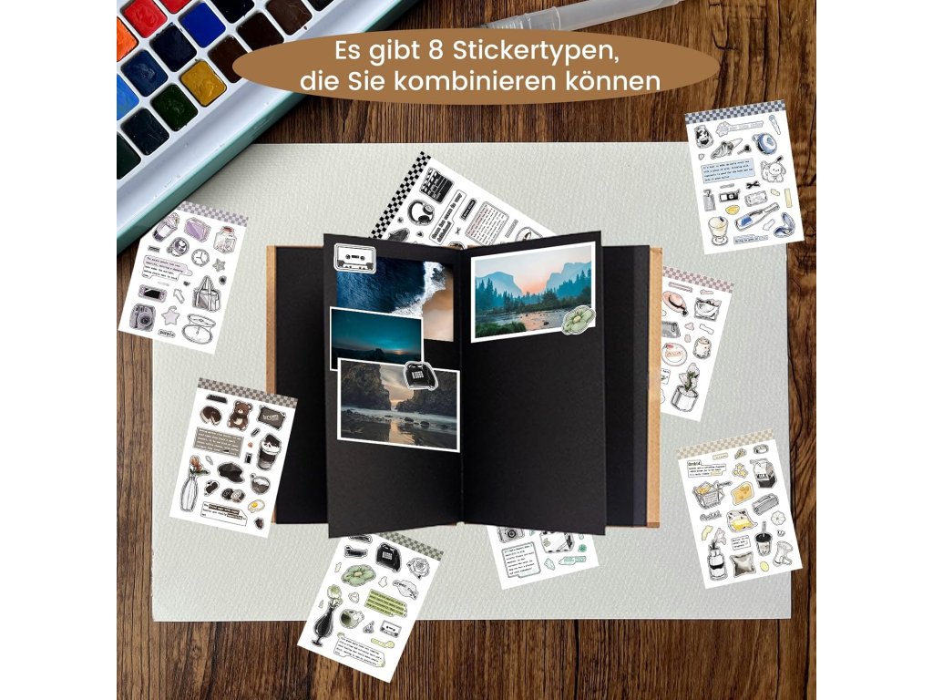 Vnitřní listy jsou vyrobeny z pevného černého kartonu se zvýšenou gramáží, což zajišťuje stabilitu nalepených fotografií a zabraňuje jejich ohýbání či jinému poškození. Obal alba je odolný proti oděru a deformacím, čímž spolehlivě chrání obsah. Součástí balení je také 102 barevných samolepek pro dekoraci a jedna náhodně vybraná kreslená samolepka, které usnadňují dozdobení jednotlivých stran ve stylu scrapbookingu. Album je ideální pro tvorbu dárků k promoci, výročí, pro zachycení pokroků miminka nebo jako cestovní deník.