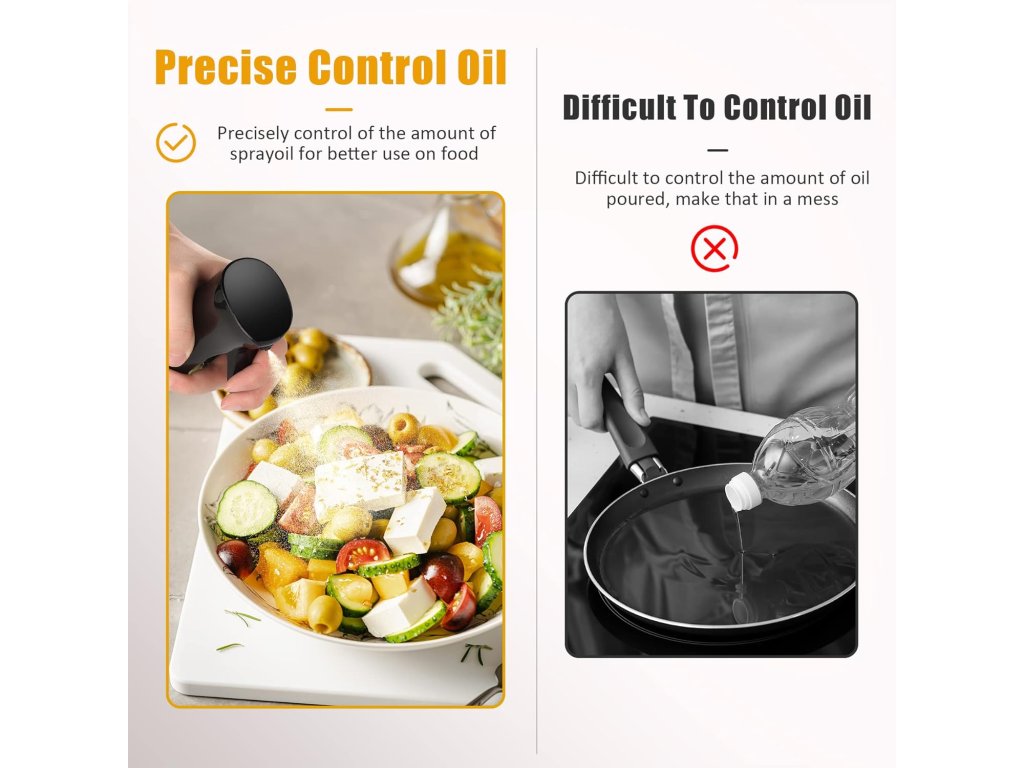 Mechanismus rozprašovače funguje na principu tlakové atomizace, kdy vylepšená tryska vytváří jemnou mlhu bez odkapávání. Rychlost a síla stlačení přímo ovlivňují úroveň rozprášení, což dovoluje přesně kontrolovat množství použitého oleje a snižovat tak kalorickou hodnotu pokrmů. Rozprašovač je vhodný pro olivový i slunečnicový olej, ocet, sójovou omáčku, citronovou šťávu nebo víno. Součástí sady je také silikonový štětec, který usnadňuje rovnoměrné roztírání omáček a marinád při vaření či pečení.