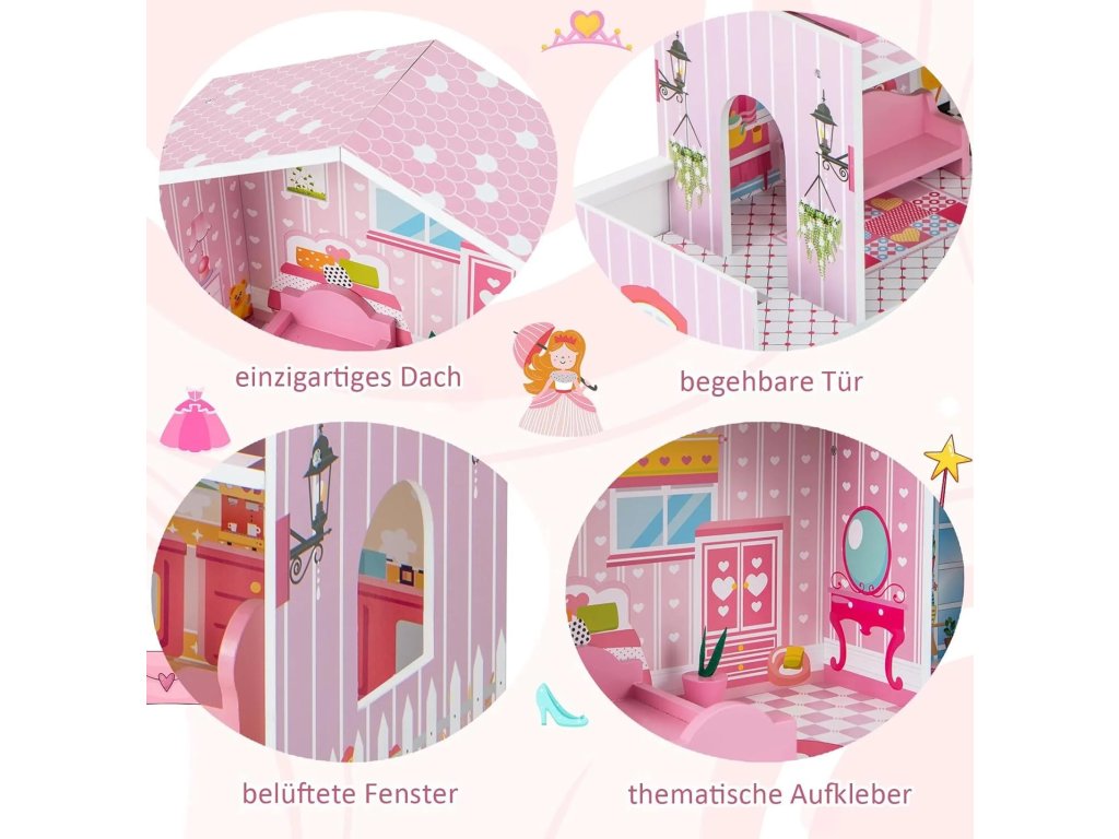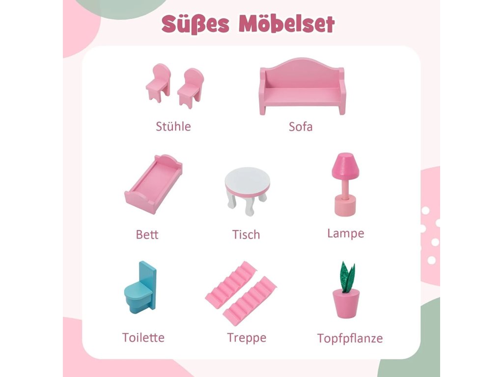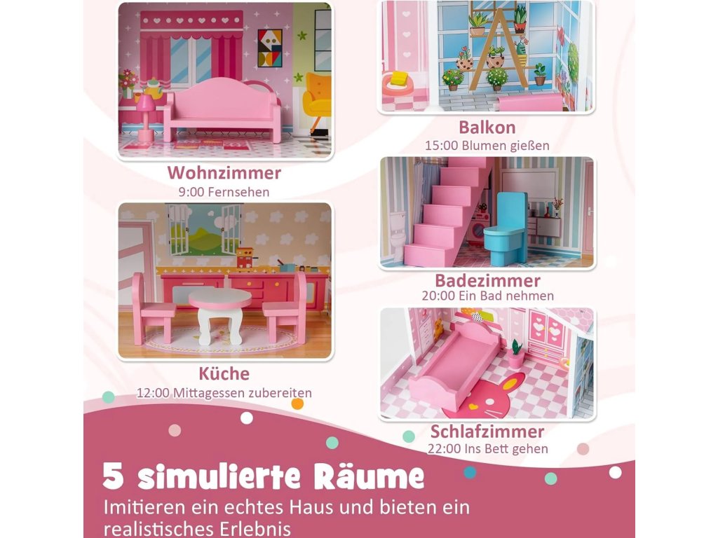 Tento dřevěný domeček pro panenky napodobuje skutečný dům s obývacím pokojem, ložnicí, kuchyní, toaletou a balkonem. Je dodáván s 10 kusy nábytku, které lze snadno přemisťovat. Každá místnost je navíc vybavena odpovídajícími tapetami a podlahovými dlaždicemi pro realistický zážitek. Hračka je vyrobena z odolného materiálu bez obsahu BPA a je bezpečná a stabilní. Podporuje u dětí kreativitu, představivost a praktické dovednosti.