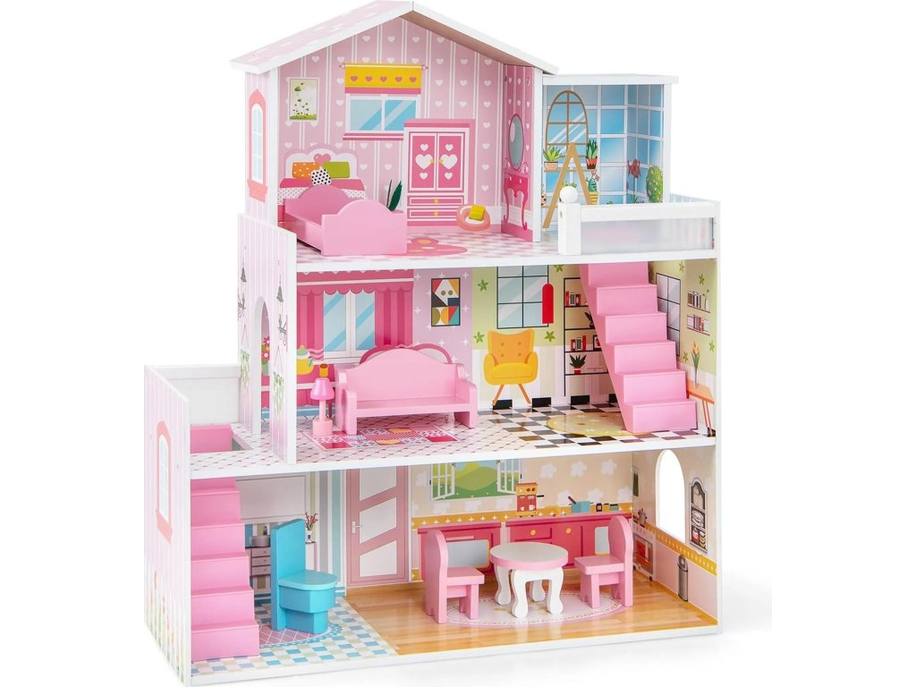 Dřevěný domeček pro panenky Costway s třemi patry a pěti místnostmi. Dodává se s deseti kusy realistického nábytku, který lze libovolně přemisťovat. Hračka je určena pro děti od 3 let.