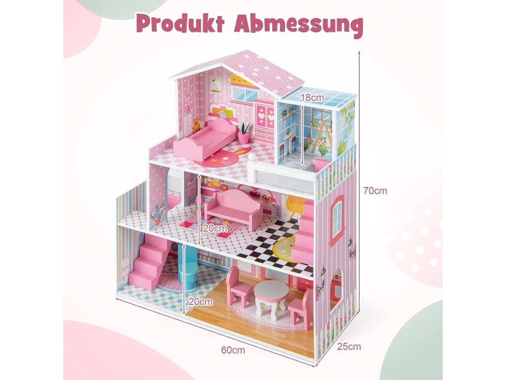 Klíčové vlastnosti Výrobce: Costway Typ produktu: Dřevěný domeček pro panenky Materiál: MDF Barva: Růžová Počet pater: 3 Počet místností: 5 Počet kusů nábytku: 10 Rozměry: 60 x 25 x 70 cm (d x š x v) Hmotnost: 6 kg