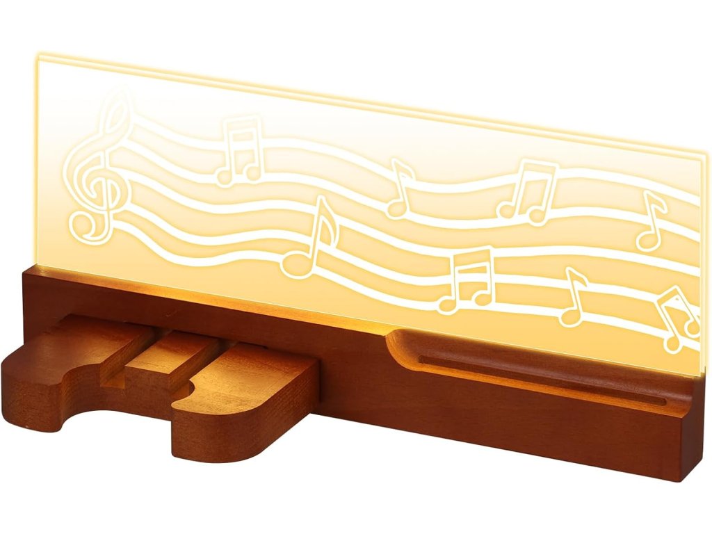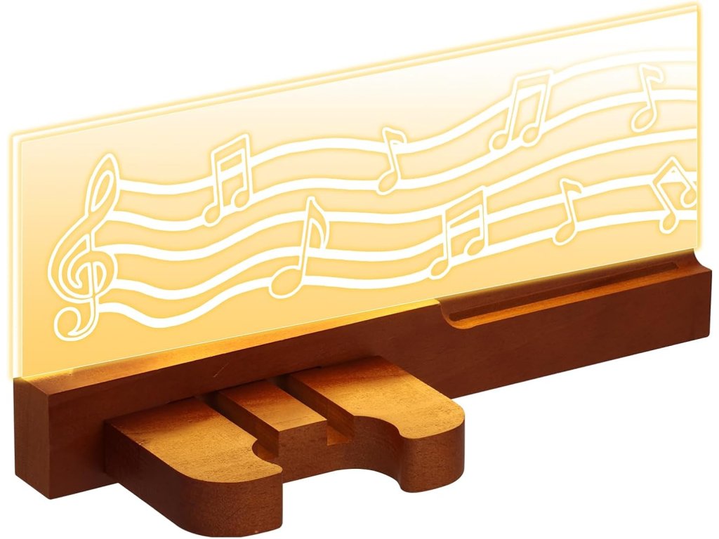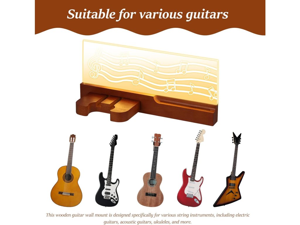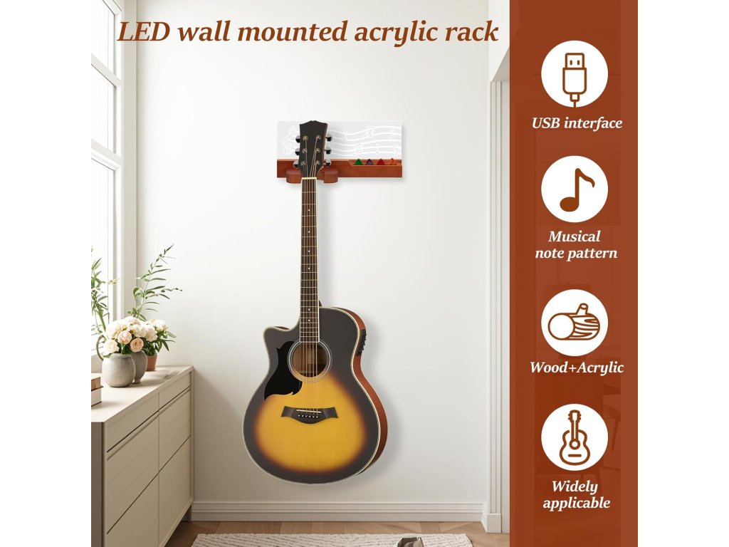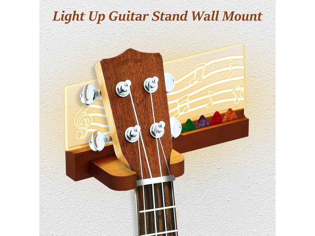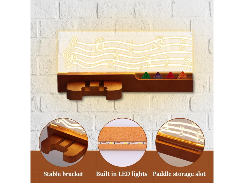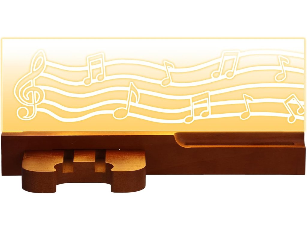Dřevěný držák na kytaru s LED osvětlením, držákem na trsátka a akrylovou deskou s notovým motivem. Vhodný pro různé strunné nástroje.