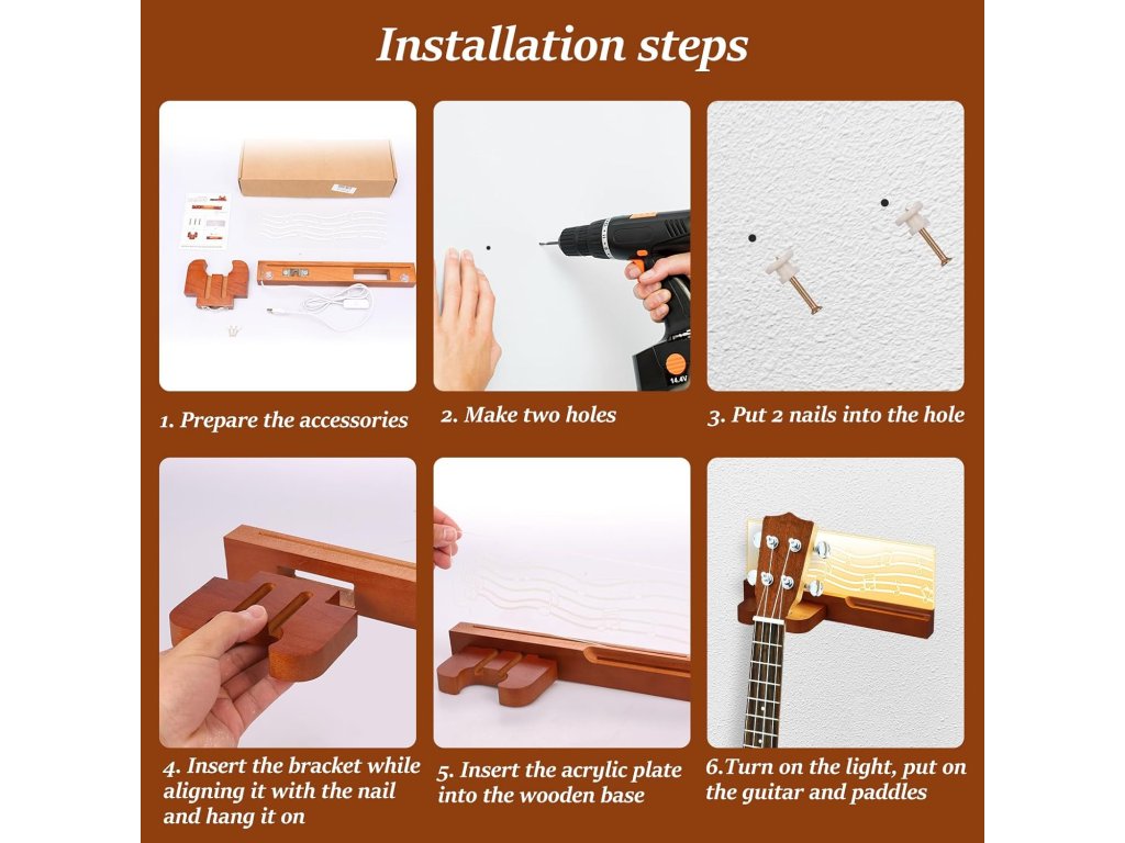 Tento praktický nástěnný držák na kytaru v hnědé barvě je vyroben z kvalitního dřeva s hladce broušeným a lakovaným povrchem, což zaručuje stabilitu a elegantní vzhled. Akrylová deska je zdobena jemnými notovými vzory, které dodají tvému pokoji umělecký nádech a podtrhnou tvůj vztah k hudbě. Integrované LED osvětlení s USB napájením jemně osvětlí tvůj nástroj a vytvoří v večerních hodinách příjemnou a romantickou atmosféru. Držák je navržen pro snadnou montáž – stačí jednoduše spojit dvě části. Je kompatibilní s většinou kytar (elektrických, akustických), ukulele a dalších strunných nástrojů, a je tak ideální pro jejich vystavení i bezpečné uložení, když se nepoužívají.