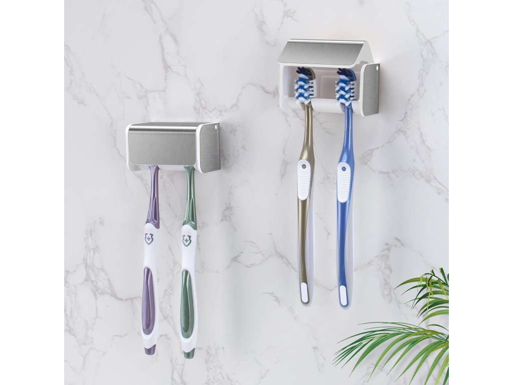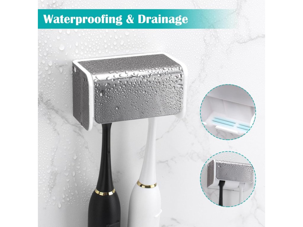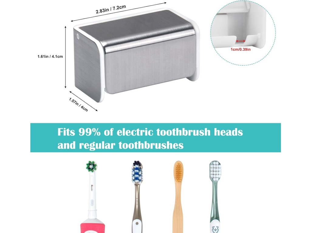 Nástěnný držák na elektrický zubní kartáček v kartáčovaném stříbrném provedení. Bez vrtání, s víkem pro hygienu, snadné čištění. Z HIPS plastu, pro celou rodinu.