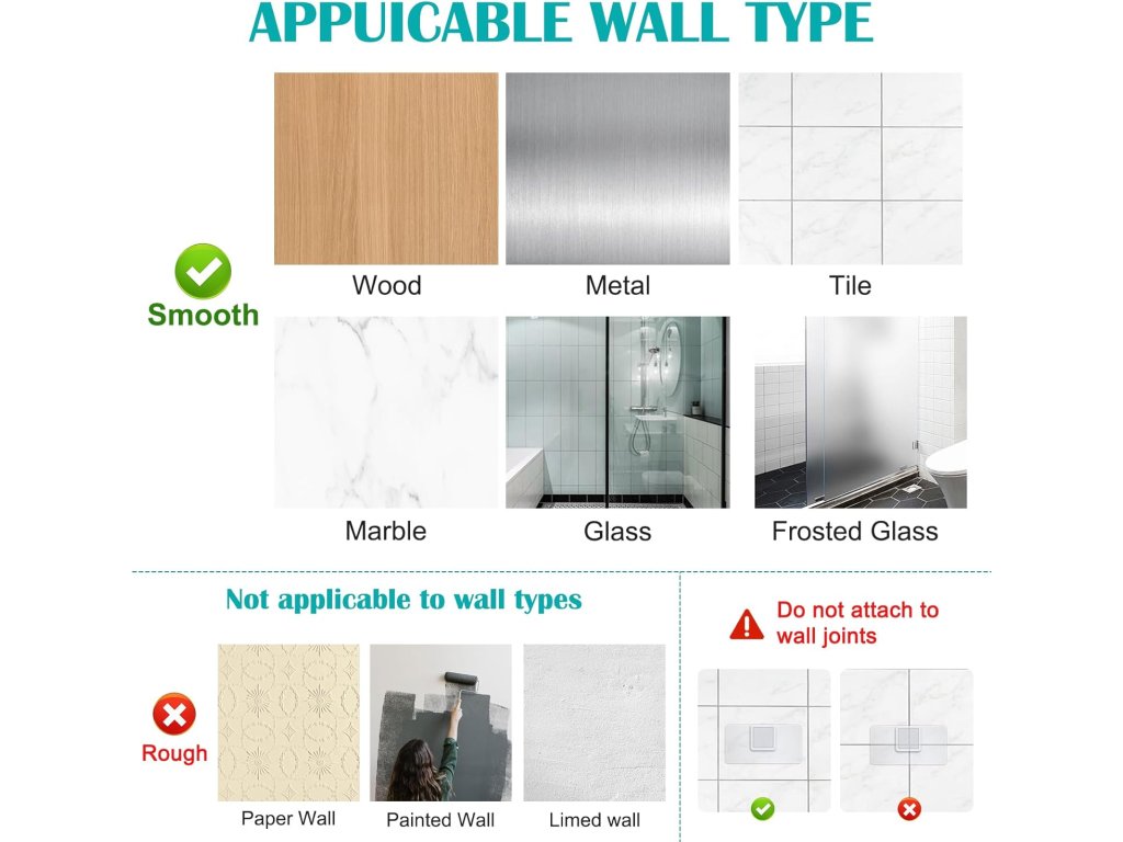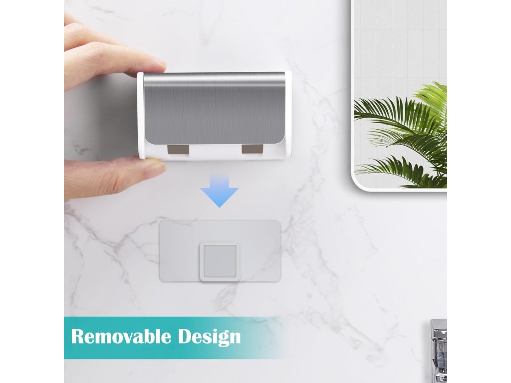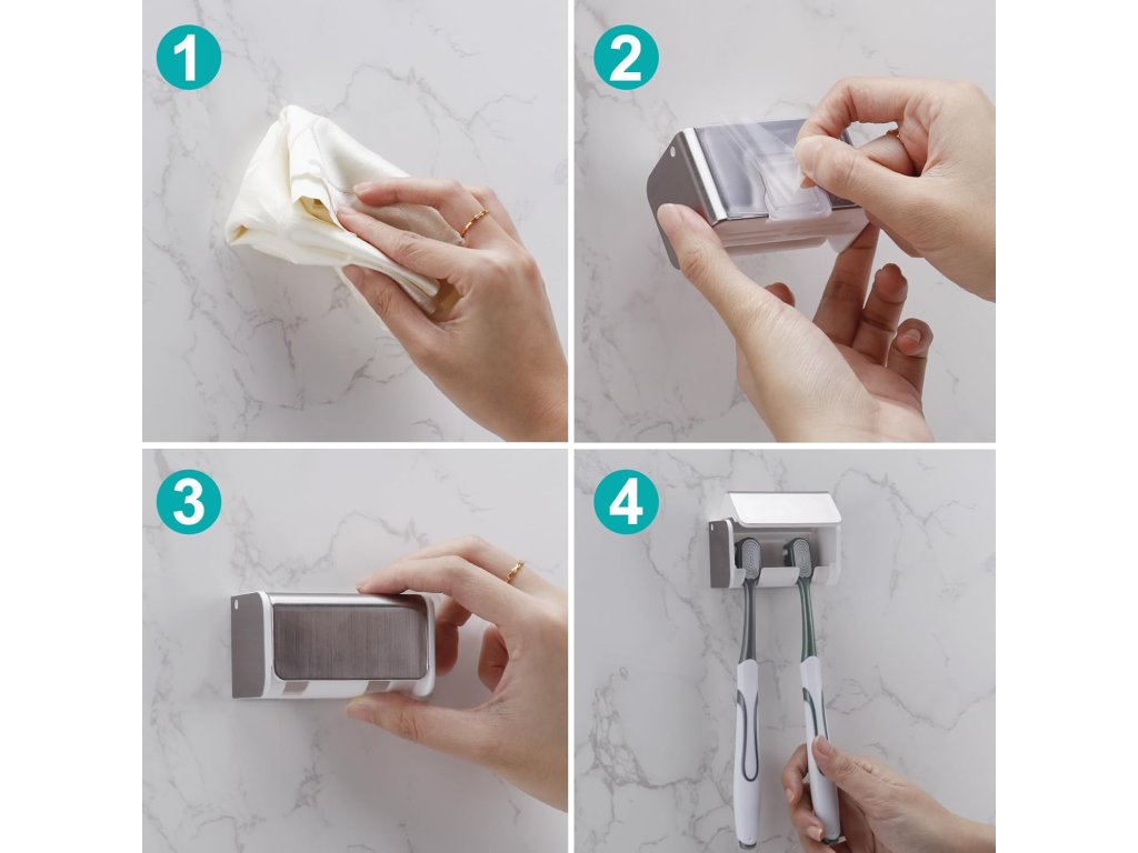 Instalace je naprosto jednoduchá a bez vrtání – stačí použít přiloženou nezanechávající lepicí pásku, která pevně drží i ve vlhkém prostředí koupelny.