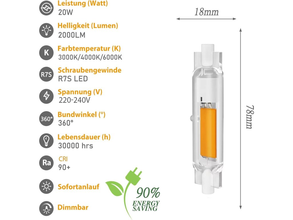 Sada dvou kusů LED žárovek značky Dvnoua využívá moderní technologii COB k dosažení vysokého světelného toku 2000 lm při spotřebě pouhých 20 W. Díky tomu dochází k úspoře až 90 % elektrické energie ve srovnání s klasickými halogenovými zdroji. Žárovka vyzařuje světlo v barevné teplotě 4000 K (přirozená bílá), která je vhodná pro domácí i kancelářské prostředí.