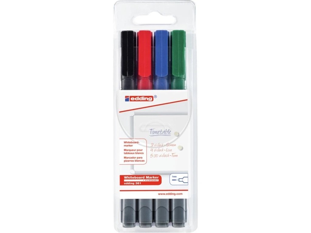 Edding 361 sada 4 popisovačů na bílou tabuli a flipchart. Tenký kulatý hrot 1 mm, barvy černá, červená, modrá, zelená. Rychleschnoucí, světlostálý, stíratelný za sucha, znovu naplnitelný.