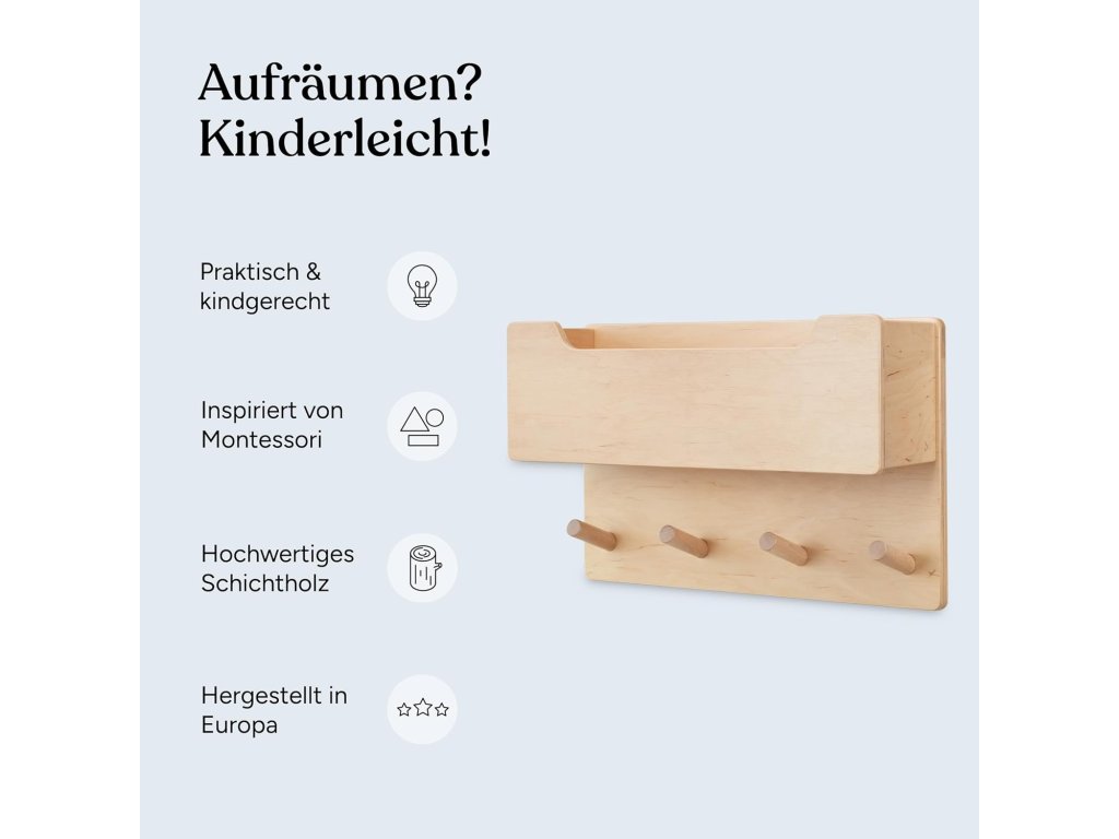 Všestranné využití: Věšák je mimořádně všestranný. Může sloužit jako nástěnný věšák na kabáty, jednotlivé háčky na oblečení nebo jako nástěnná police s prostorem pro klobouky a doplňky. Poskytuje dostatek místa pro veškeré dětské oblečení a doplňky.