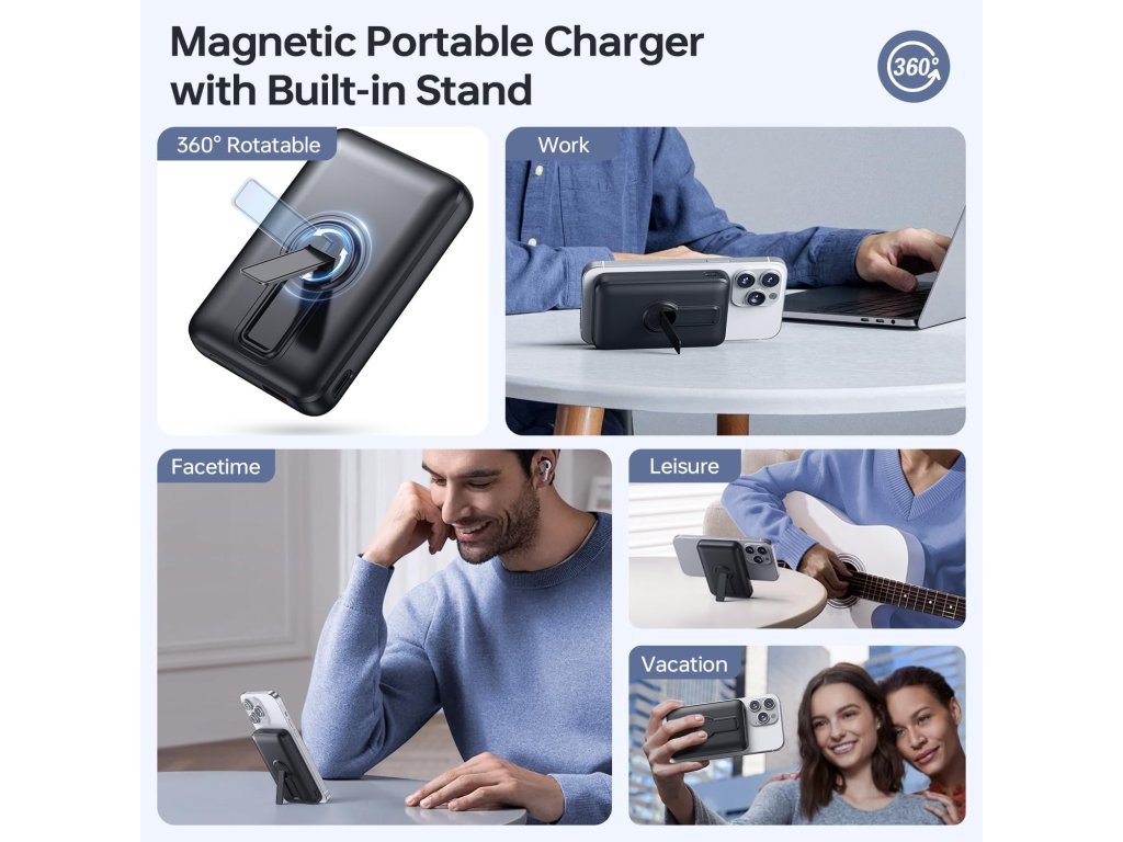 Zařízení disponuje funkcí rychlého nabíjení PD 22,5 W, které zkracuje dobu nabíjení oproti standardním nabíječkám. Integrovaný LED displej přehledně zobrazuje zbývající kapacitu baterie v procentech a indikuje aktivní rychlé nabíjení. Unikátním prvkem je 360° otočný stojánek, který umožňuje polohování telefonu v úhlu až 60° pro pohodlné sledování obsahu nebo videohovory během procesu nabíjení. Powerbanka dovoluje nabíjet až tři zařízení současně prostřednictvím portu USB-A, USB-C a bezdrátové plochy. Díky kompaktním rozměrům a hmotnosti 203 g je vhodná pro cestování a splňuje parametry pro přepravu v letecké dopravě.