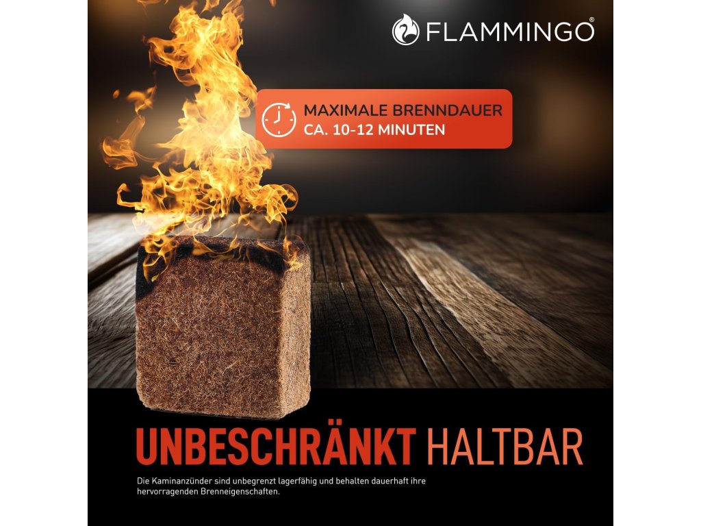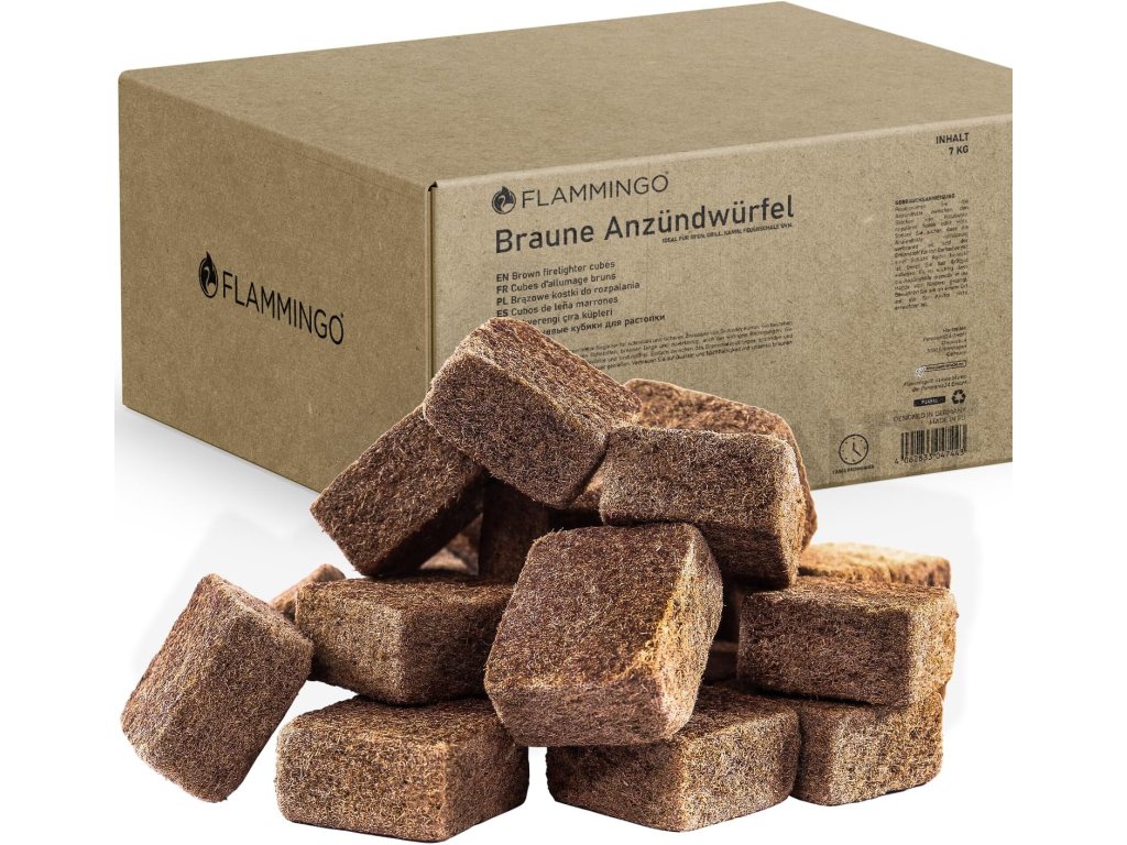 Ekologické hnědé zápalné kostky Flammingo, balení 7 kg (cca 875 ks), doba hoření 10-12 min/kostka, rozměry 27x27x15 mm. Bez zápachu, z obnovitelných zdrojů. Pro grily, krby, kamna i ohniště.
