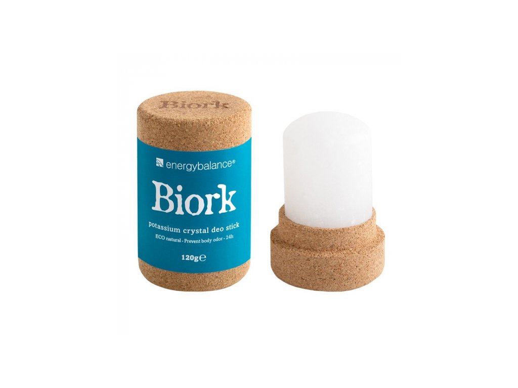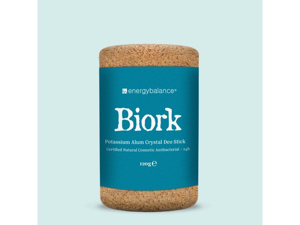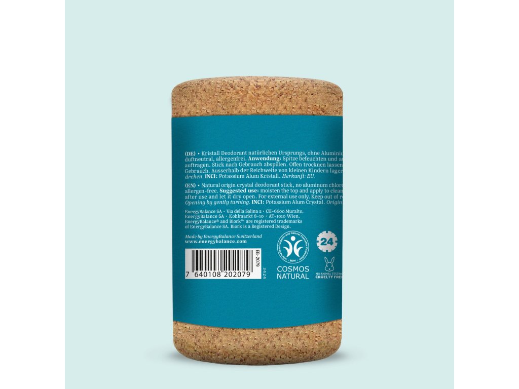 Biork™ přírodní deodorant 120g. Krystal draslíku, 24h ochrana, bez hliníku, parfemace a testování na zvířatech. Ekologický korkový obal.