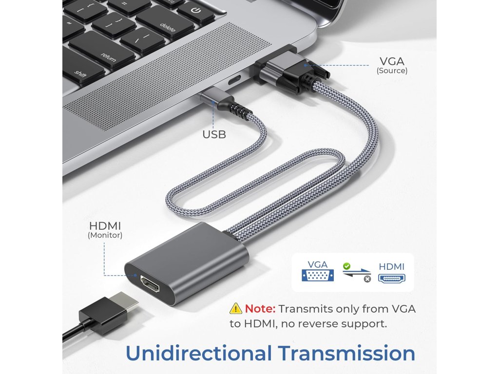 Vynikající konverze signálu: Adaptér využívá pokročilý vestavěný IC čip k převodu analogových VGA signálů na digitální HDMI signály, což zajišťuje špičkový vizuální zážitek. Je důležité poznamenat, že tento adaptér je jednosměrný a nepodporuje přenos signálu z HDMI zdroje na VGA monitor.