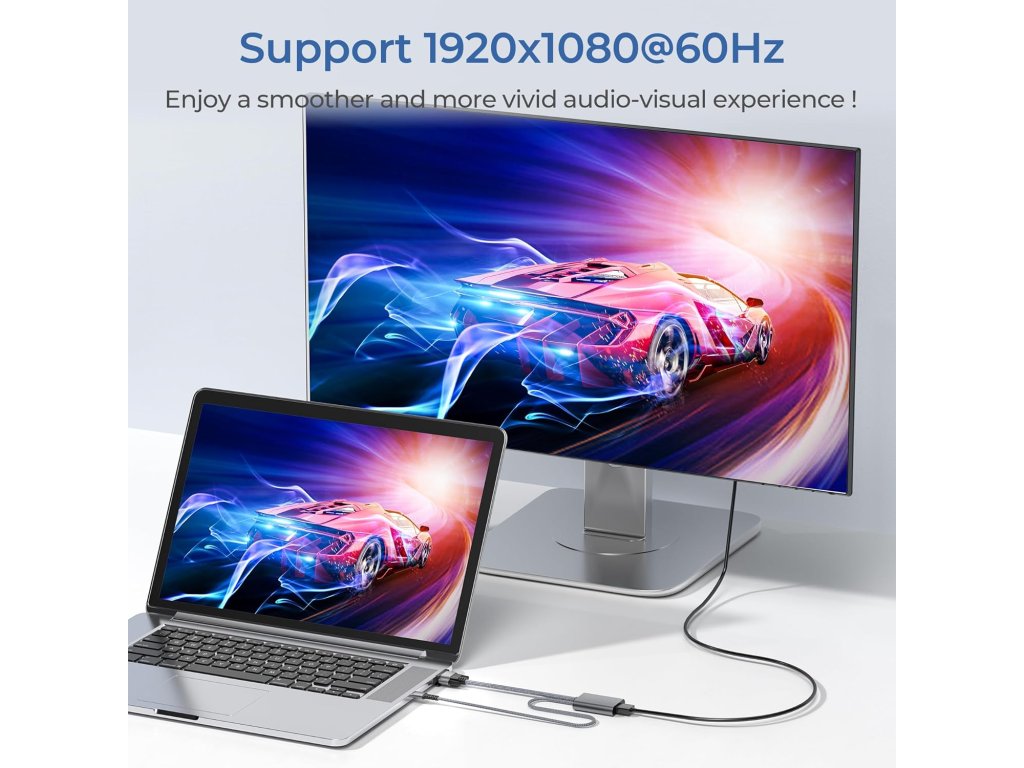 Vizuály ve vysokém rozlišení: Adaptér podporuje rozlišení obrazovky 1920x1080 a obnovovací frekvenci 60Hz, což vám poskytuje vysoce kvalitní a plynulý zážitek ze sledování.