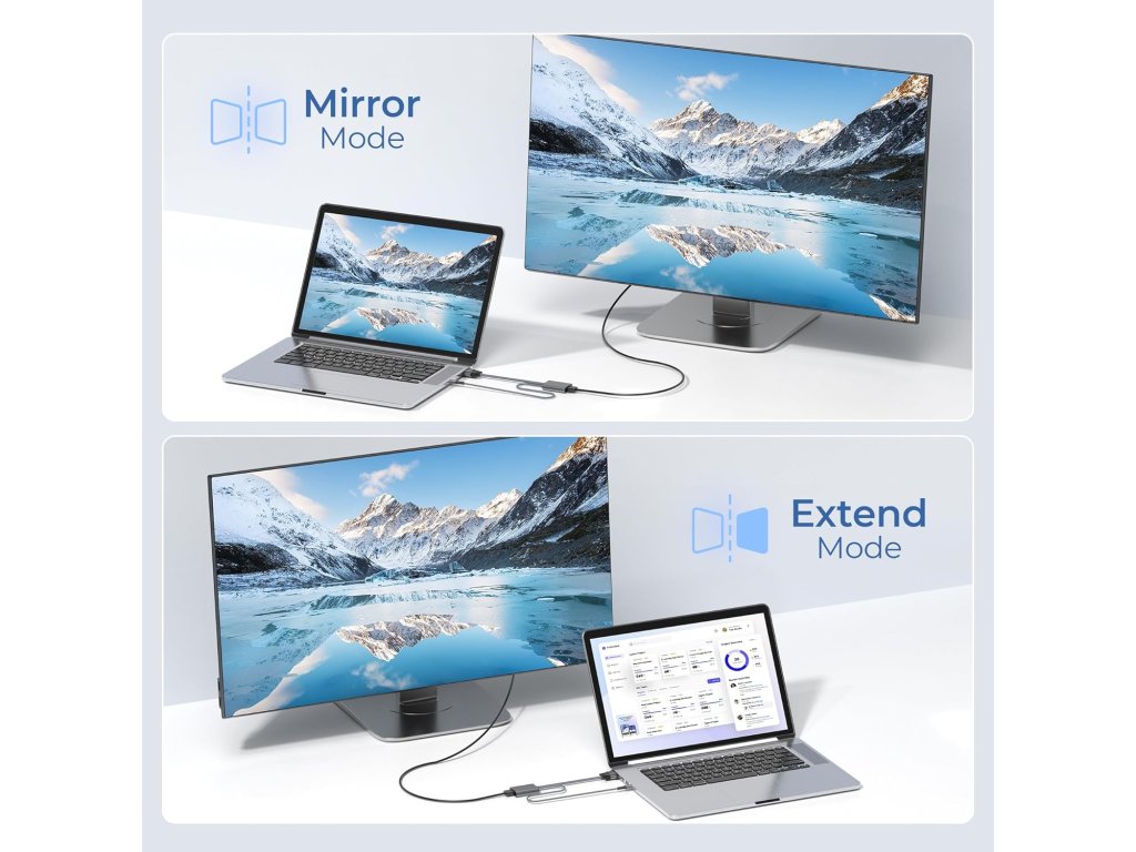 Podpora audio výstupu: Integrovaný USB kabel podporuje přenos zvuku. Uživatelé mohou v nastavení zvuku svého systému vybrat možnost "Digitální USB audio", což umožní přenos zvuku na připojený displej. Pro zajištění stability a optimálního výkonu vyžaduje adaptér externí napájení přes USB kabel. Vezměte prosím na vědomí, že funkčnost audio výstupu může být ovlivněna faktory, jako jsou operační postupy počítače a verze systému.