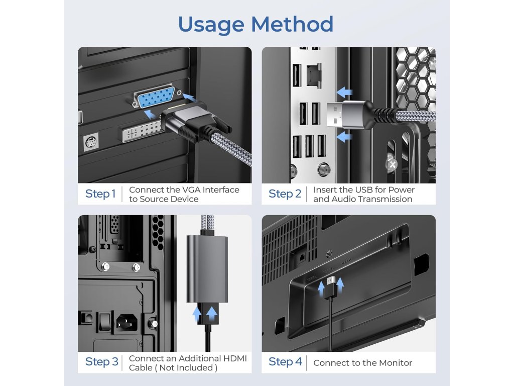 Adaptér je vybaven pokročilým vestavěným IC čipem, který zajišťuje čistou a spolehlivou konverzi signálu. Získáte Full HD obraz v rozlišení 1920x1080 s obnovovací frekvencí 60 Hz pro plynulý zážitek. Kromě obrazu přenáší adaptér také zvuk přes integrovaný USB kabel, který slouží zároveň jako externí napájení pro stabilní výkon. Stačí v nastavení zvuku vybrat „Digital USB Audio“ a můžete si užívat video i se zvukem.