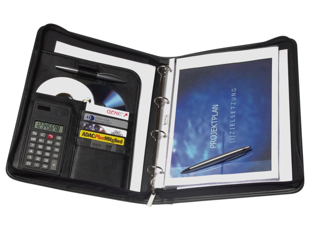 Elegantní černé A4 spisové desky Genie Exclusiv se zipem, kroužky, přihrádkami, kalkulačkou a blokem. Imitace kůže.