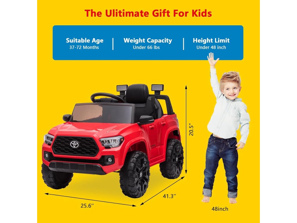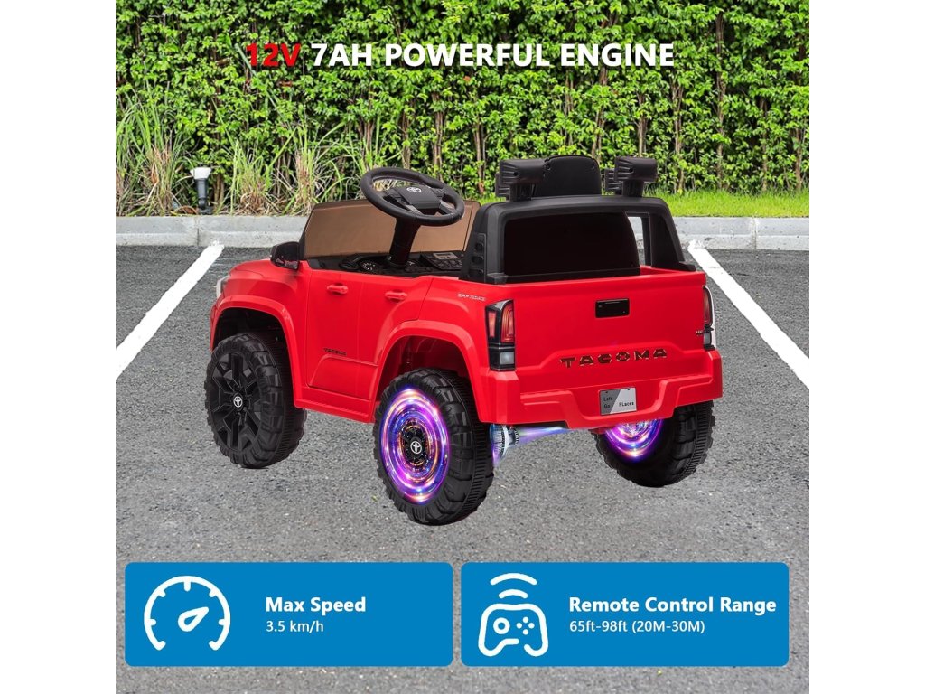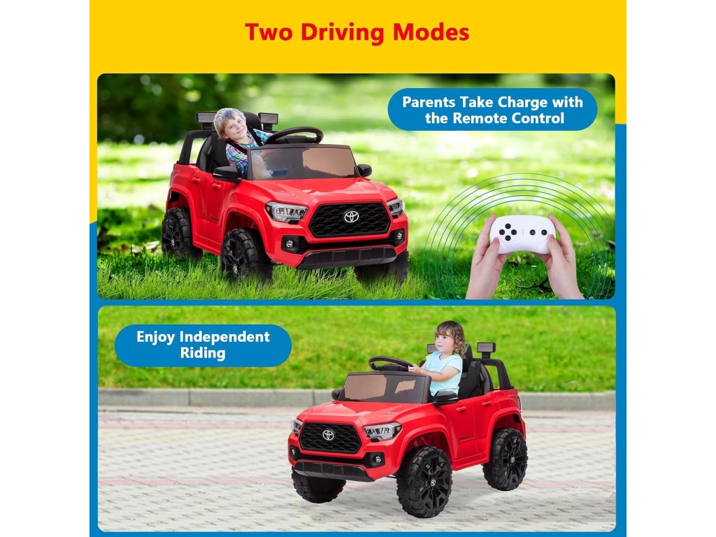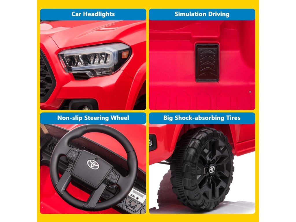 Tento licencovaný model Toyota Tacoma věrně kopíruje design skutečného vozu a nabízí malým řidičům prémiové funkce. Bezpečnost dětí je zajištěna nastavitelným bezpečnostním pásem a inovativním systémem Soft Start, který zaručuje plynulý rozjezd bez trhnutí. Rodiče mají nad vozidlem neustálý dohled díky dálkovému ovladači, který umožňuje korigovat směr jízdy nebo vozidlo bezpečně zastavit.