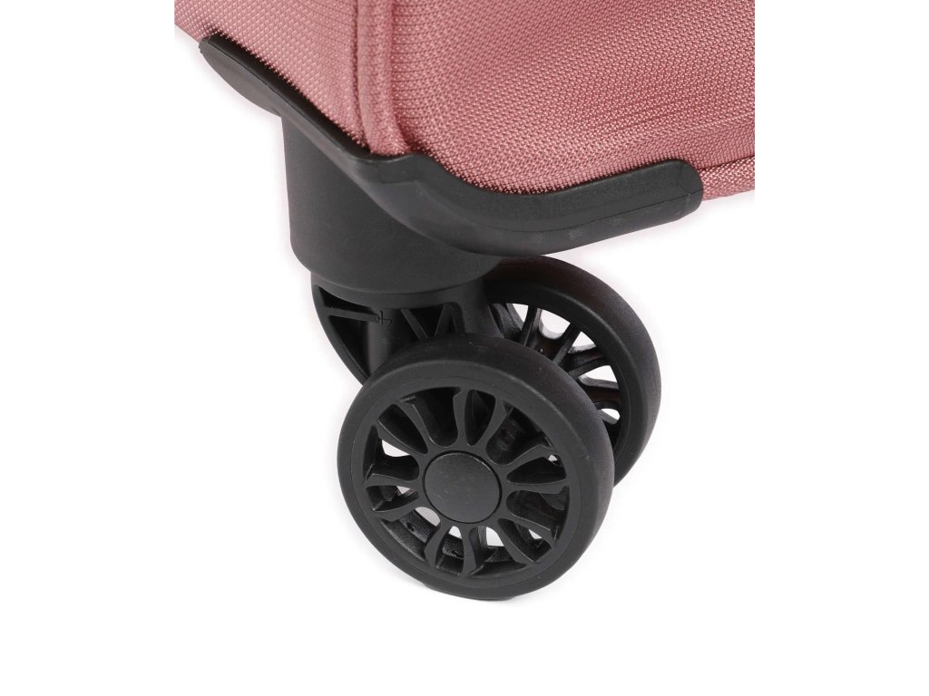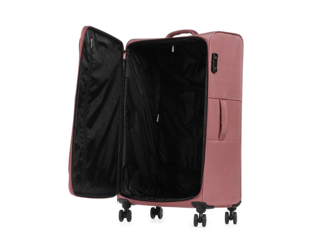 Snadnou manipulaci s plně naloženým kufrem zajišťují čtyři nehlučná dvojitá kolečka otočná o 360 stupňů a stabilní výsuvná rukojeť se dvěma rameny. Pro bezpečné cestování do zahraničí je kufr osazen integrovaným TSA zámkem s číselnou kombinací a uzamykatelným dvoucestným zipem. Vnitřní prostor s dekorativní podšívkou disponuje kompresními popruhy pro stabilizaci obsahu a samostatnou přihrádkou na zip pro lepší organizaci věcí.