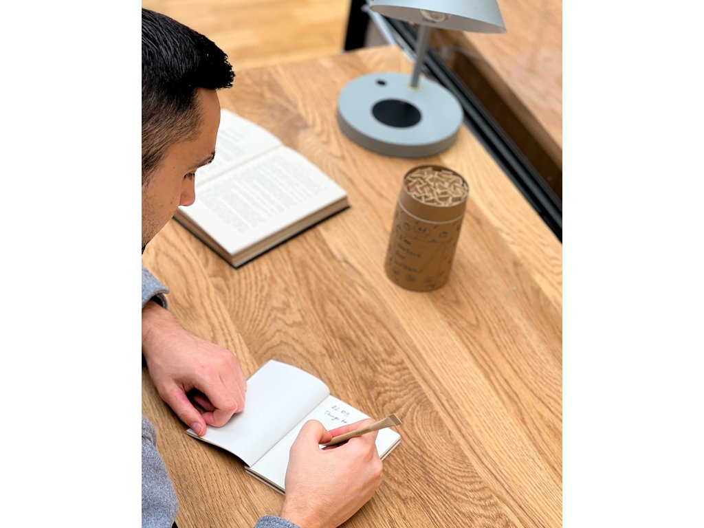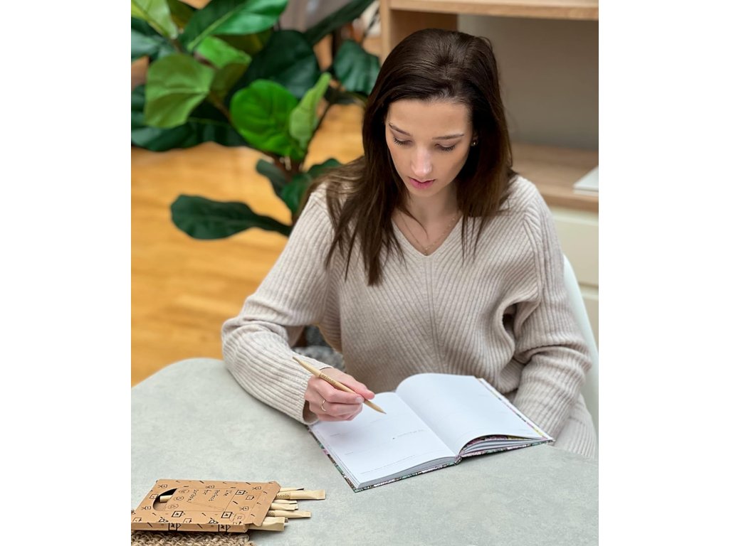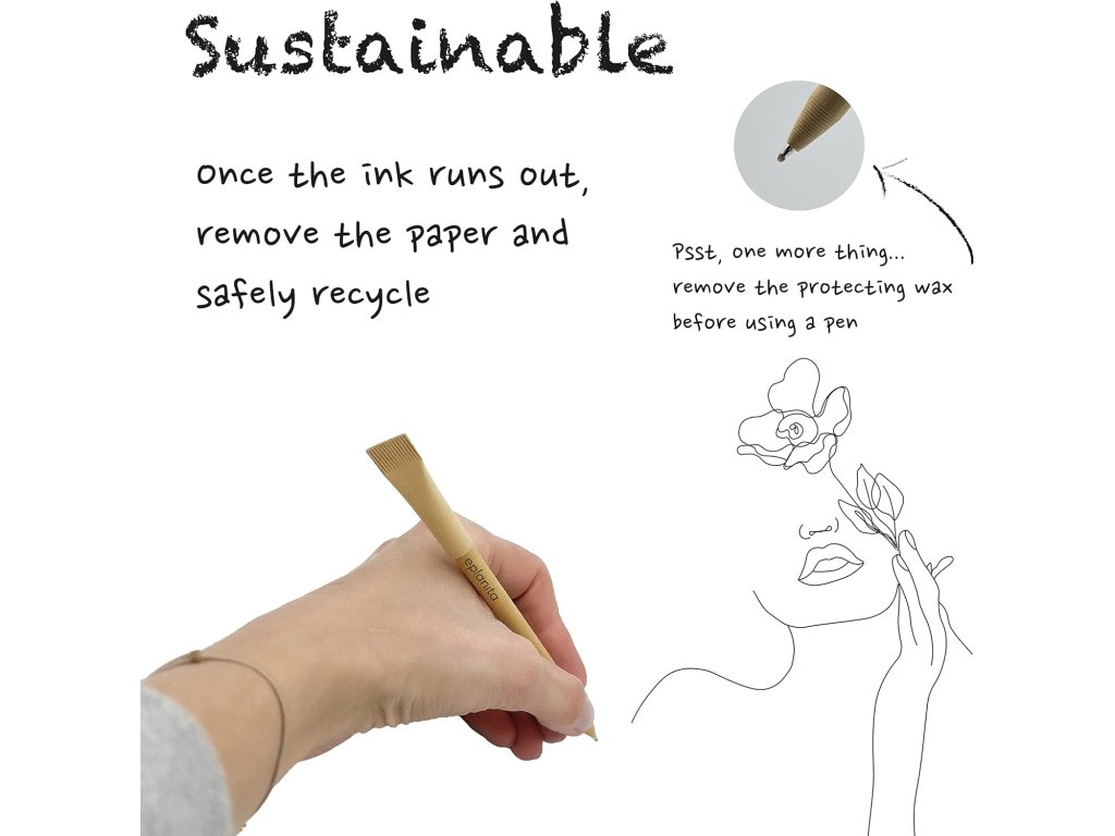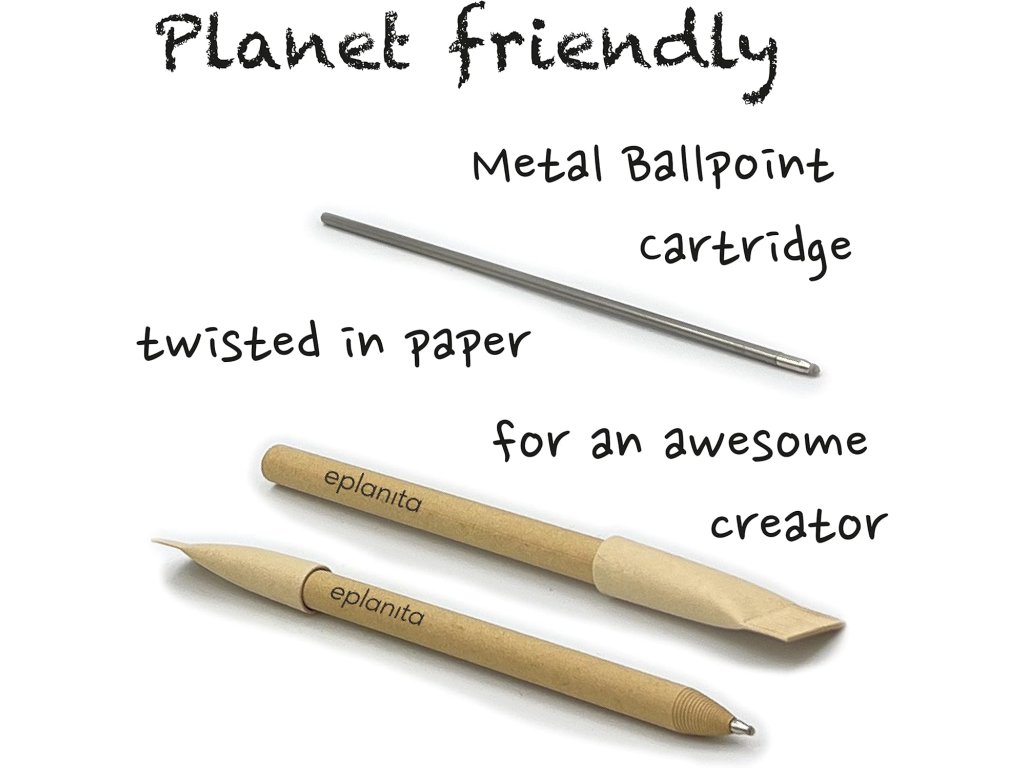 Tato sada 48 ekologických kuličkových per eplanita I’M PERFECT FOR SCRIBBLE představuje šetrnou volbu pro psaní i kreslení. Pera jsou vyrobena z kraftového papíru a nerezové oceli, čímž minimalizují použití plastů. Kuličkový hrot zajišťuje plynulý a konzistentní tok černého inkoustu s výraznou intenzitou na papíře. Matný papírový povrch a minimalistický design propůjčují perům profesionální vzhled, ideální pro kancelář, školu i domácnost. Po vypotřebování inkoustu lze pero bezpečně recyklovat – kraftový papír lze z pera odstranit namočením ve vodě. Balení je rovněž ekologické, vyrobené z recyklovaného kraftového papíru. Pevná tubovitá krabička je navíc znovupoužitelná, například jako pokladnička.