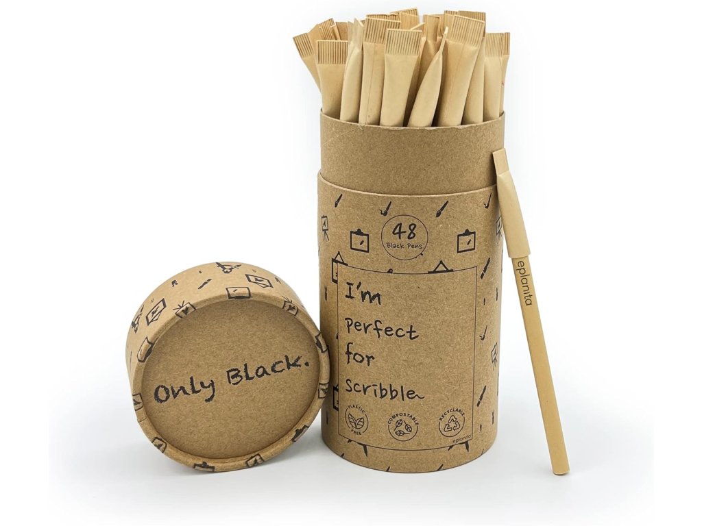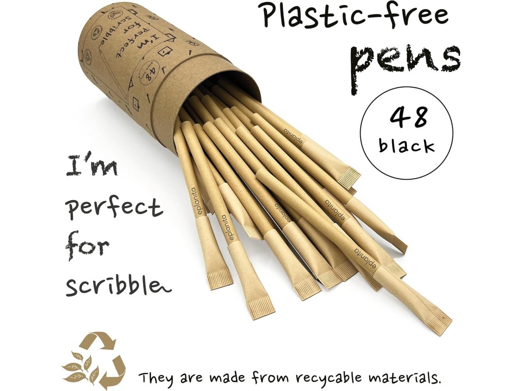 Balení 48 ekologických kuličkových per eplanita I’M PERFECT FOR SCRIBBLE s černým inkoustem, vyrobených z kraftového papíru a nerezové oceli.
