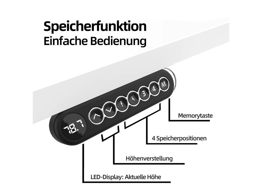 - 4 paměťové pozice: Díky 4 programovatelným předvolbám si můžete uložit oblíbené výšky pro sezení a stání. Jednoduše kliknete a stůl se automaticky nastaví na uloženou polohu. To je ideální i pro více uživatelů!