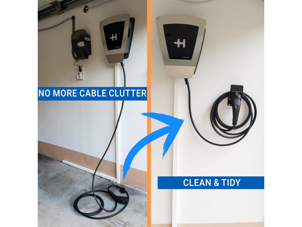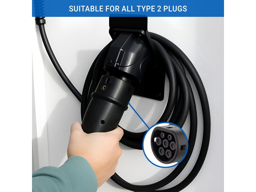 Využití Držáku (bez kabelu, ten není součástí balení) je univerzálně použitelný pro všechna elektrická vozidla využívající standard Typ 2. Slouží k přehlednému uložení kabelu, čímž zabraňuje jeho povalování na zemi, snižuje riziko zakopnutí a chrání samotnou koncovku před mechanickým opotřebením nebo znečištěním.