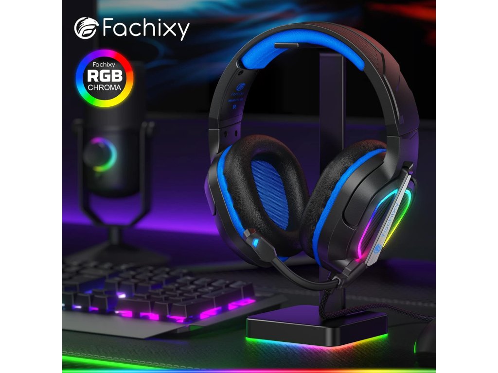 Herní headset Fachixy FC200 je drátová souprava s 3,5mm jackem navržená pro PS4 PS5 PC Xbox Nintendo Switch a další zařízení. Headset poskytuje stereo prostorový zvuk díky 50mm neodymovým měničům a je vybaven nastavitelným mikrofonem s potlačením šumu. Stylové měkké RGB osvětlení dodává vizuální efekt. Ergonomická a lehká konstrukce (0,3 kg) zajišťuje pohodlí i při dlouhém hraní.