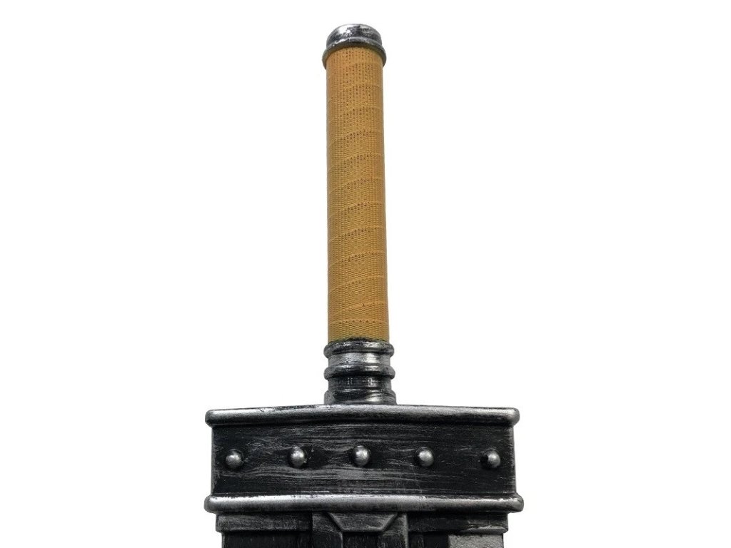 Materiál meče připomíná tvrdou gumu, což zajišťuje tvarovou stálost a zároveň bezpečnost při manipulaci. Na rozdíl od kovových modelů je tento kus lehký, není ostrý a nepředstavuje skutečnou zbraň, takže je vhodný pro kostýmové akce i jako hračka. Povrchová úprava věrně napodobuje ocelový vzhled včetně charakteristických otvorů u záštity, čímž dodává rekvizitě autentický styl známý z herní předlohy.