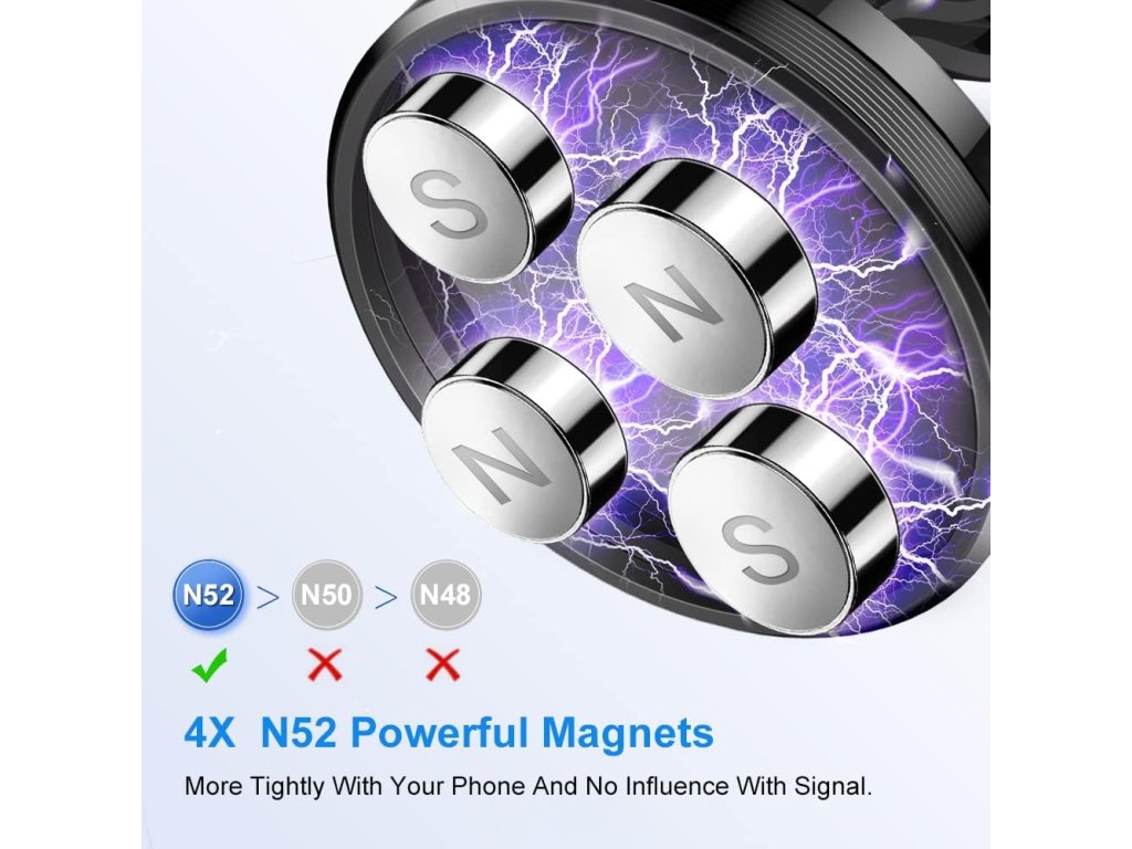 Magnetický držák je vybaven vynikající lepící podložkou a 6 silnými magnety N52, což zaručuje mimořádně silnou a koncentrovanou magnetickou sílu. Ta nemá žádný vliv na signál telefonu. Díky vylepšenému kyvadlovému designu lze držák otáčet o 360° a jeho základní upevnění umožňuje otáčení o 120°.