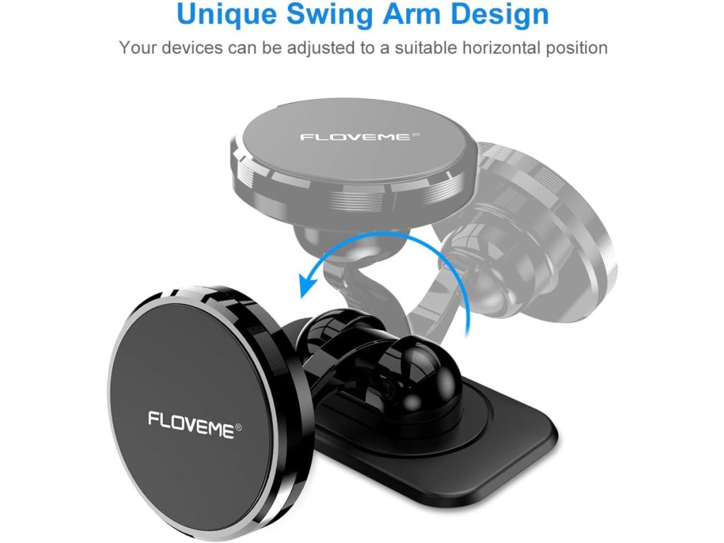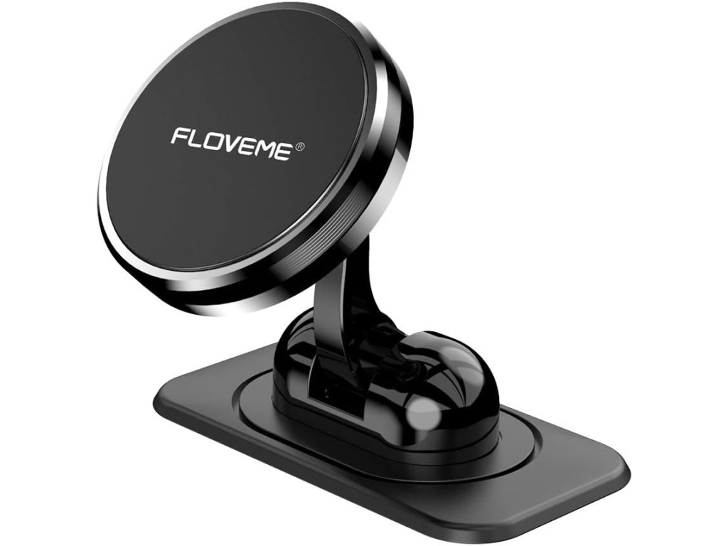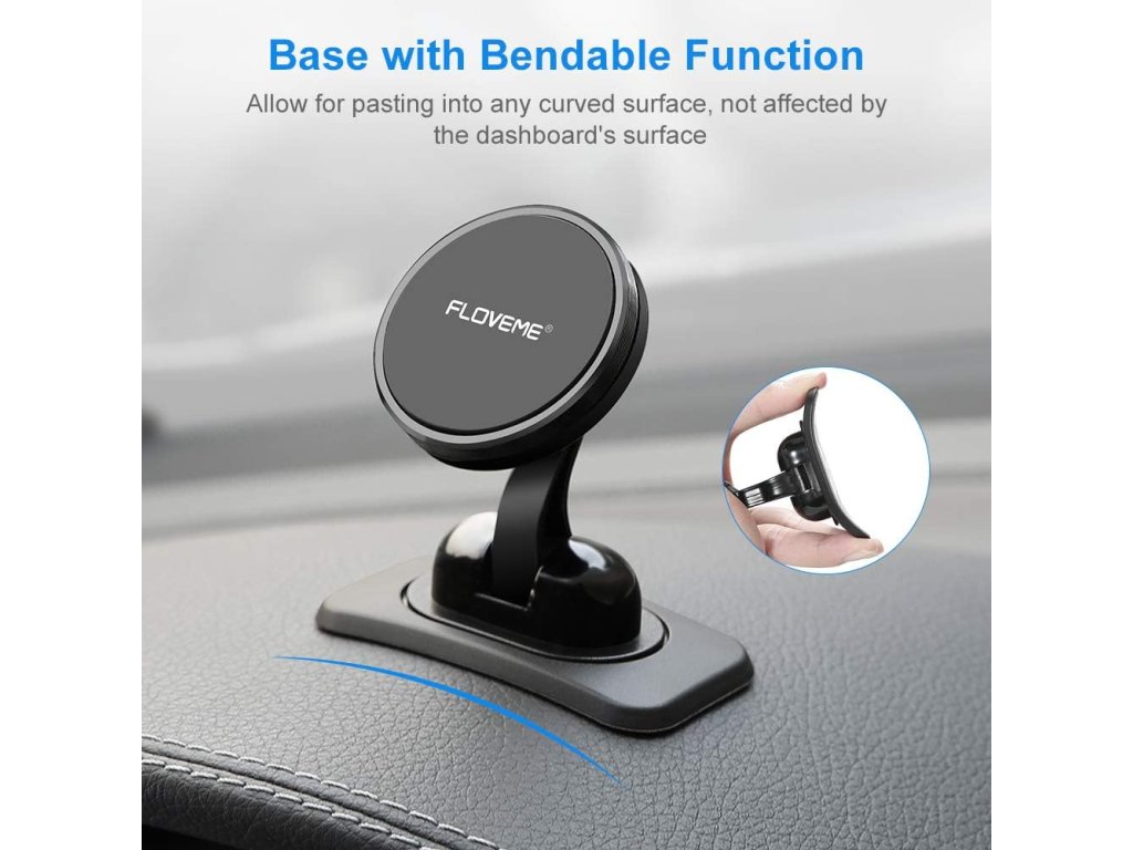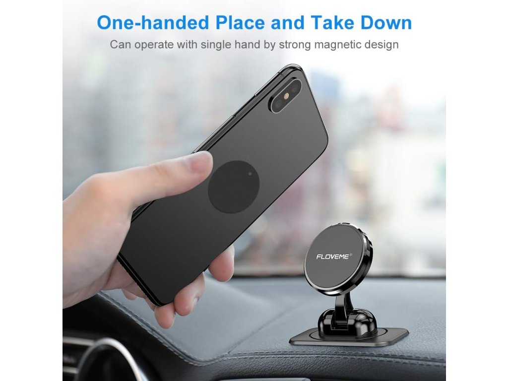 FLOVEME magnetický držák telefonu do auta s lepící základnou pro palubní desku. Je vybaven 6 silnými magnety N52 a otočným designem (360° otočný kloub, 120° otočná základna) pro optimální pozorovací úhel. Snadná instalace i na zakřivené povrchy, kompatibilní se všemi smartphony a mini tablety (3.5 až 7.9 palců). Balení obsahuje náhradní lepící podložku a dvě kovové destičky.