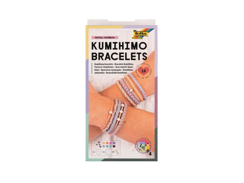 Kreativní sada Folia pro výrobu Kumihimo náramků a náramků přátelství. Obsahuje 16 dílů včetně příze, korálků a dvou pletacích disků. Vhodná pro děti i dospělé.