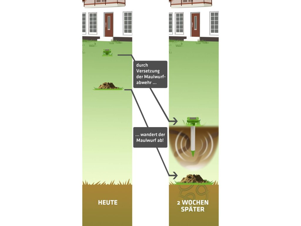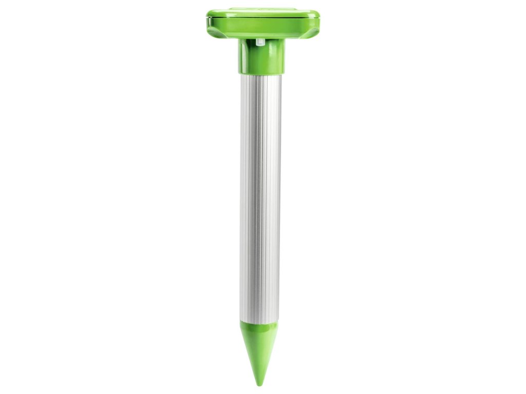 Díky robustní konstrukci z hliníku a odolného ABS plastu je přístroj určen pro dlouhodobé venkovní použití s vysokým stupněm krytí IP56 proti nepříznivým vlivům počasí. Integrovaný solární panel zajišťuje napájení vnitřního akumulátoru, což umožňuje zcela autonomní provoz bez nutnosti výměny baterií nebo natahování kabelů. Vibrace o frekvenci 400 Hz se šíří v intervalu každých 45 sekund a dokážou pokrýt plochu až 700 m² (v závislosti na typu půdy). Kombinace zelené a stříbrné barvy nenarušuje vzhled zahrady a hliníkové tělo usnadňuje zapuštění do země.