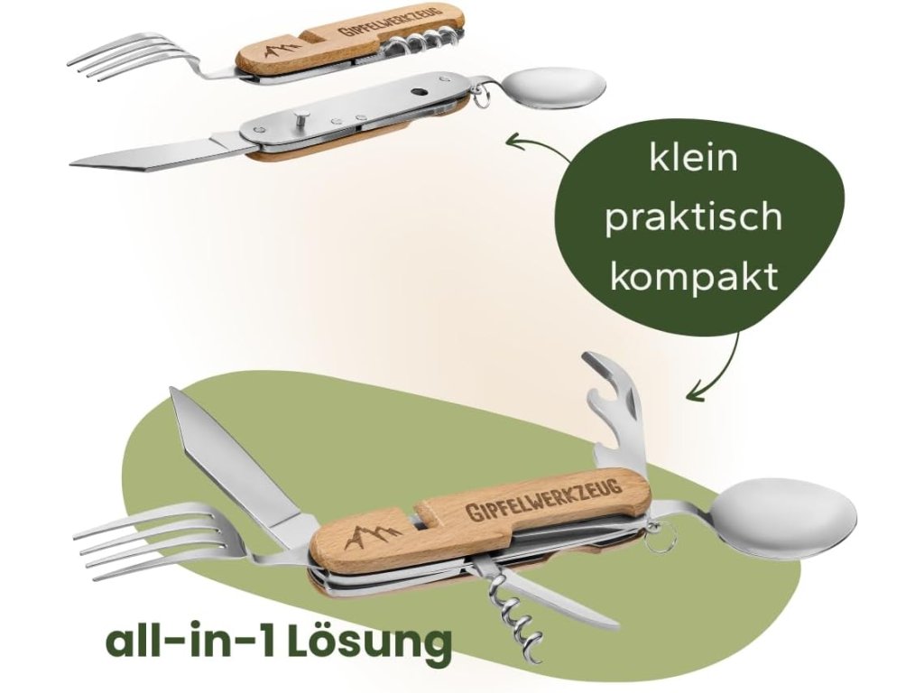 Tento multifunkční kempinkový příbor Gipfelgaudi je ideálním společníkem pro každé vaše outdoorové dobrodružství, ať už se chystáte na piknik v přírodě, náročný survival výlet nebo turistiku na vrchol hory. Tento nástroj 5 v 1 je vždy připraven k použití! Kombinace kvalitní nerezové oceli a odolného bukového dřeva zaručuje, že se na tento příbor můžete spolehnout na všech svých cestách. Je praktický, stylový a zároveň navržený pro dlouhou životnost. Díky svým kompaktním rozměrům (4 x 11 cm) se tento kempinkový příbor snadno vejde do jakékoli malé přihrádky v batohu nebo dokonce do kapsy kalhot, což ocení zejména minimalističtí cestovatelé a ti, kteří chtějí ušetřit každý gram a centimetr místa. Příbor lze snadno rozložit na dvě samostatné části, takže můžete současně používat nůž, vidličku nebo lžíci, což je ideální pro pohodlné stolování v přírodě. Se svým příborem To Go od Gipfelgaudi si na každém svém dobrodružství zajistíte nejen praktického pomocníka, ale i kouzelné okamžiky spojené s jídlem v krásné přírodě.