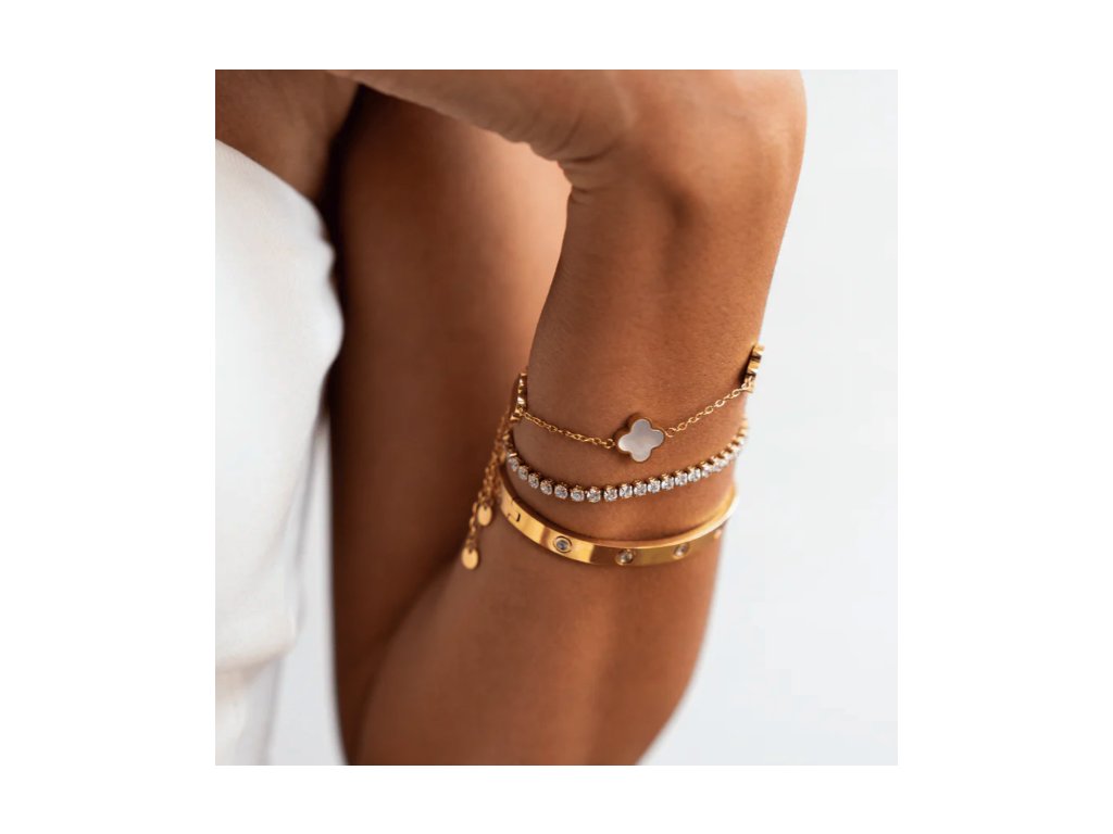 Tento náramek je klasickým doplňkem, který se hodí pro každou příležitost. Je vyroben z nerezové oceli 316L a je osázen kameny 5A Zirconia pro extra lesk. Má nastavitelnou délku 16 cm s 4cm prodloužením nebo 18 cm s 4cm prodloužením. Jeho povrchová úprava je z cca 18karátové zlaté slitiny.