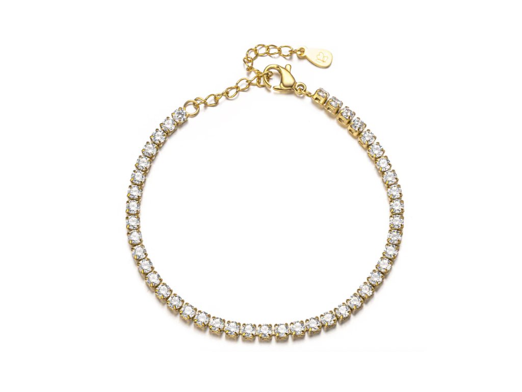 Tenisový náramek je vyroben z nerezové oceli a pokoven cca 18karátovým zlatem. Je osázen 3mm zirkony a má nastavitelnou délku.