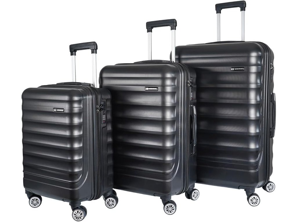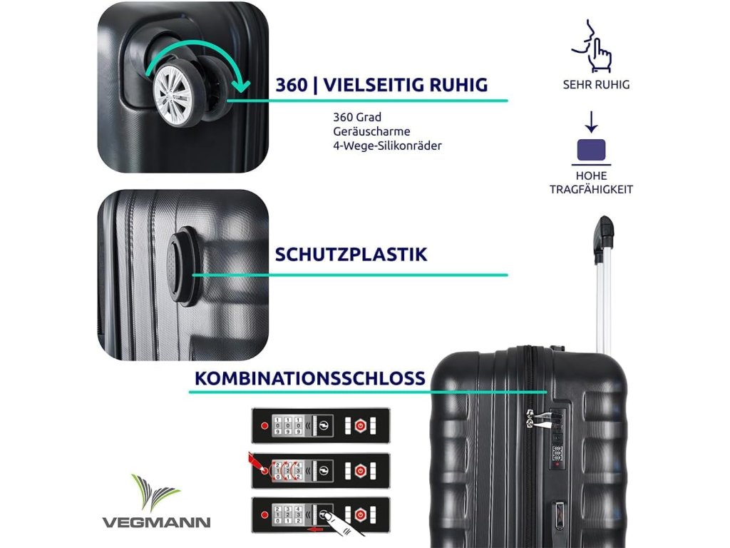GlassZilla VEGMANN je moderní 3dílná sada cestovních kufrů v černé barvě která pokrývá všechny cestovní potřeby od krátkých výletů po dlouhé dovolené. Kufry jsou vyrobeny z odolného 100% ABS plastu s tvrdou skořepinou. Každý kufr je vybaven čtyřmi 360° otočnými kolečky teleskopickou hliníkovou rukojetí a integrovaným kombinačním zámkem. Sada obsahuje rozměry M L a XL které jsou vhodné pro mnoho leteckých společností.