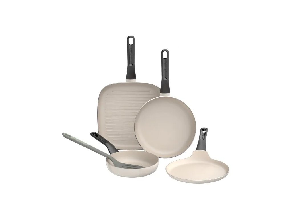 Sada 4 nepřilnavých pánví BergHOFF Glints Spirit je všestranná kolekce pro každodenní vaření vyrobená z recyklovaného hliníku. Obsahuje dvě klasické pánve (20 cm 24 cm) grilovací pánev (26 cm) a pánev na palačinky (24 cm). Pánve mají zdravý nepřilnavý keramický povrch CeraGreen (bez PFAS) a jsou vhodné pro všechny typy sporáků včetně indukce. Součástí je také obracečka vyrobená z recyklovaného plastu.