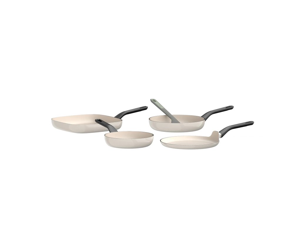 Všechny pánve mají fenolové rukojeti stay-cool které zůstávají chladné na dotek a zajišťují tak bezpečné přenášení z plotny na stůl. Pánve jsou vhodné pro všechny varné desky včetně indukce a jsou trouby bezpečné do 180 °C. Součástí sady je navíc obracečka Slotted Turner vyrobená z recyklovaného plastu která nepoškrábe nepřilnavý povrch a má tenkou pružnou hranu pro snadné podsunutí pod jídlo.