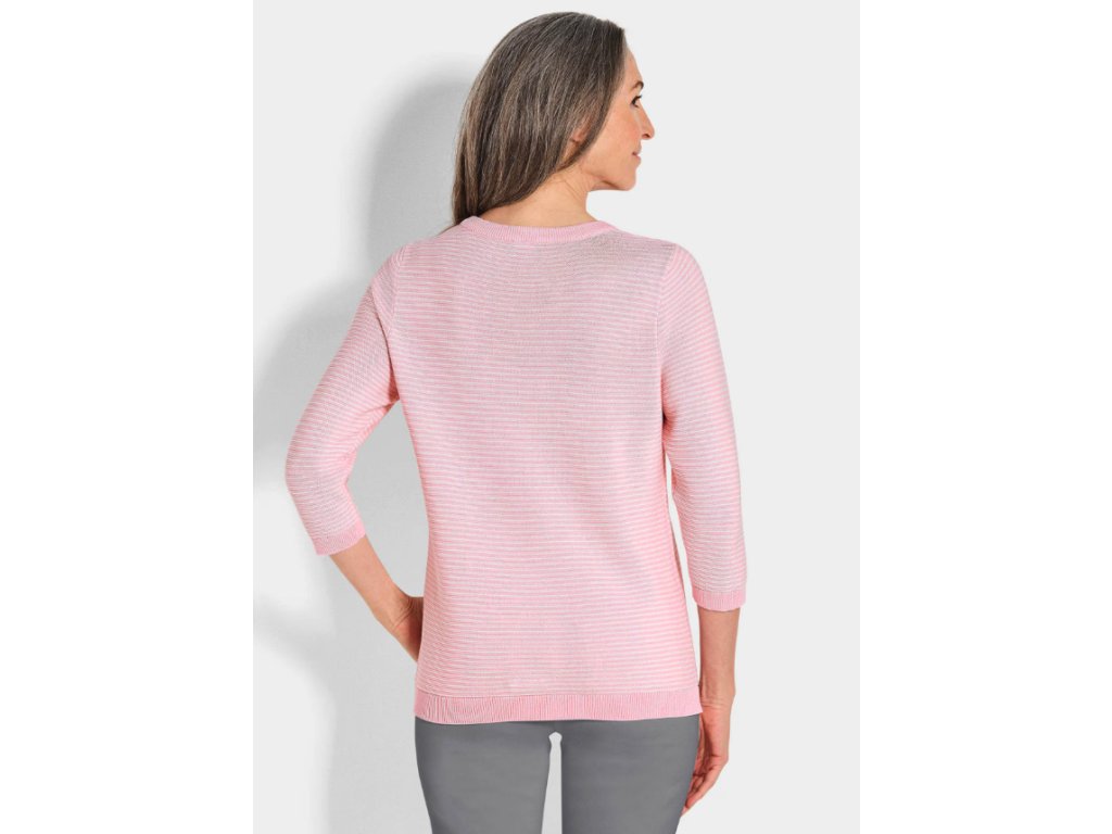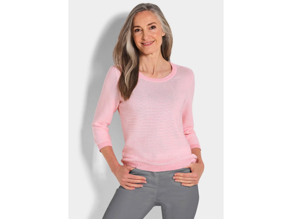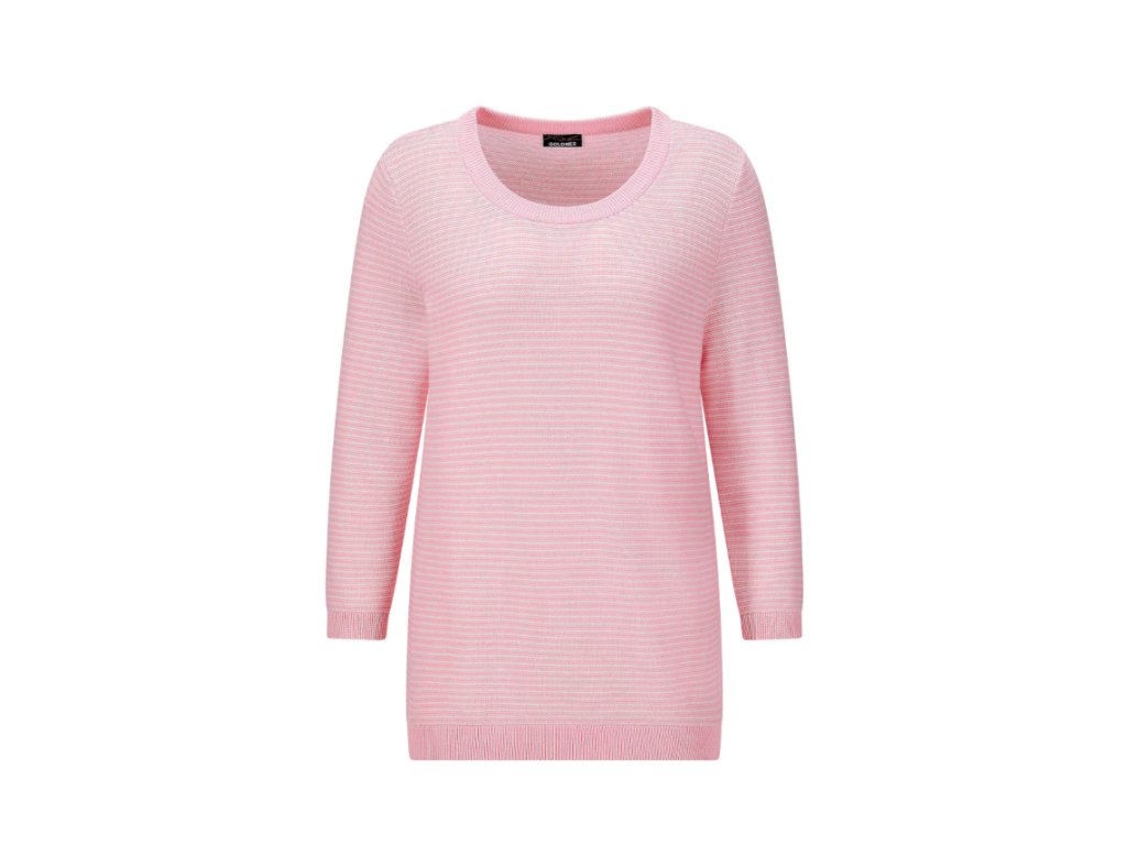 Svetr značky Goldner je vyroben z jemného úpletu z čisté bavlny, která zajišťuje pohodlí a prodyšnost při kontaktu s pokožkou. Dvoubarevný pruhovaný vzor s levým očkem pleteniny vytváří zajímavý prostorový efekt. Rovný střih v kombinaci s tříčtvrtečními rukávy poskytuje volnost pohybu a je vhodný pro běžné denní nošení. Kulatý výstřih je zakončen žebrovaným lemem a rukávy i spodní okraj svetru jsou ukončeny úzkými manžetami.