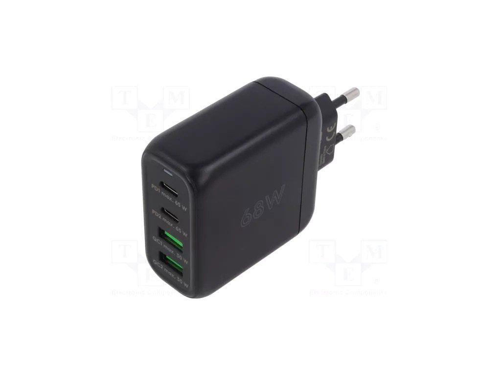 Tato univerzální cestovní nabíječka kombinuje vysoký výkon s kompaktními rozměry a zajišťuje bezpečné a efektivní nabíjení vašich zařízení. Spínaný síťový zásuvkový zdroj (pro Evropu). Výkon 68 W. Technologie Využívá technologii GaN (nitrid galia) pro vyšší účinnost a menší rozměry (99 x 61 x 295 mm). Účinnost 867 % (Energy efficiency Level VI). Výstupy a nabíjení USB A a USB C Power Delivery (PD 30). Podporuje Quick Charge. Parametry Výstupní napětí v rozsahu 33–11 V DC a pevné hodnoty 45 V 5 V 9 V 12 V 15 V 20 V DC. Jmenovitý proud v rozsahu 15 A až 5 A. Integrovaná ochrana proti přetížení (OPP) přehřátí (OTP) a protizkratová ochrana (SCP). Vhodné pro smartphone a tablet (Apple Huawei iPad iPhone LG Samsung Galaxy Sony Xiaomi). Vstupní Napětí 100–240 V AC.