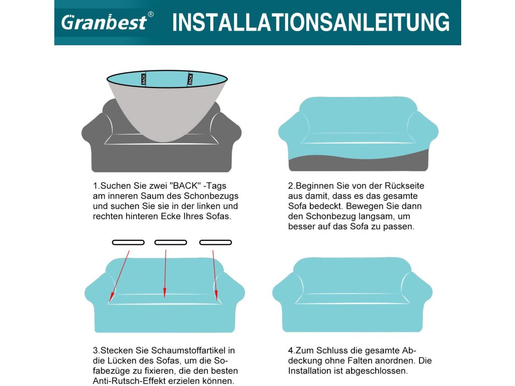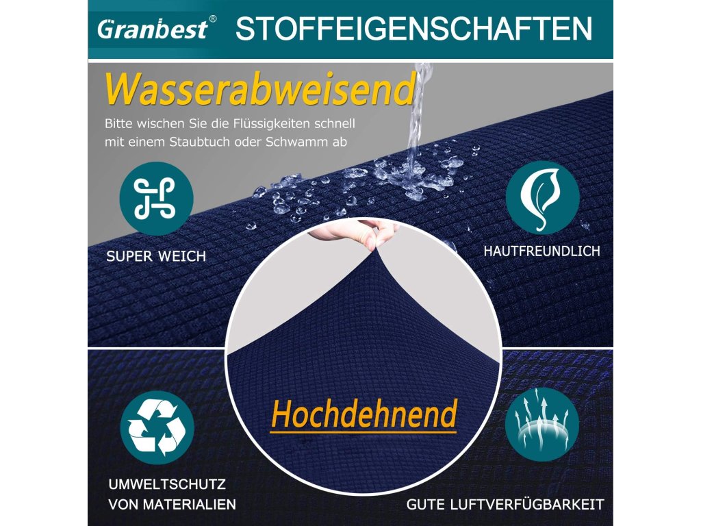 Potah na pohovku od značky Granbest je vyroben z měkké a pružné tkaniny, která kombinuje 95 % polyesteru a 5 % spandexu. Díky této materiálové směsi je potah vysoce roztažitelný, odolný proti mačkání a trvanlivý. Inovativní vodoodpudivá vrstva chrání nábytek před náhodným politím a běžnými skvrnami, což z něj činí ideální volbu pro domácnosti s dětmi nebo domácími mazlíčky (tekutiny je nutné odstranit z povrchu ihned, potah není plně vodotěsný).