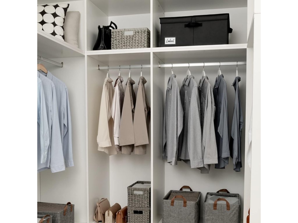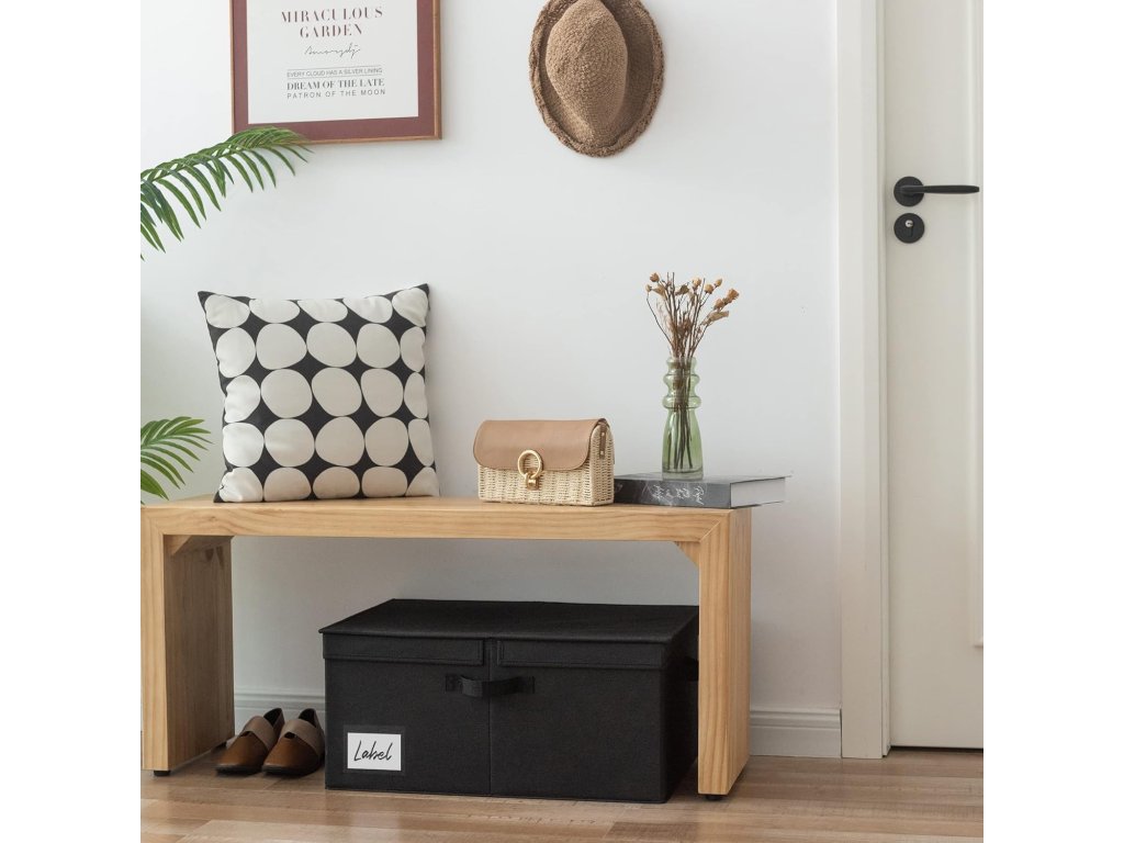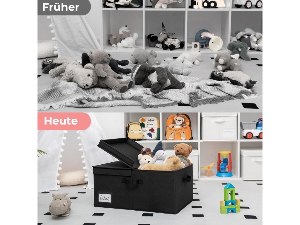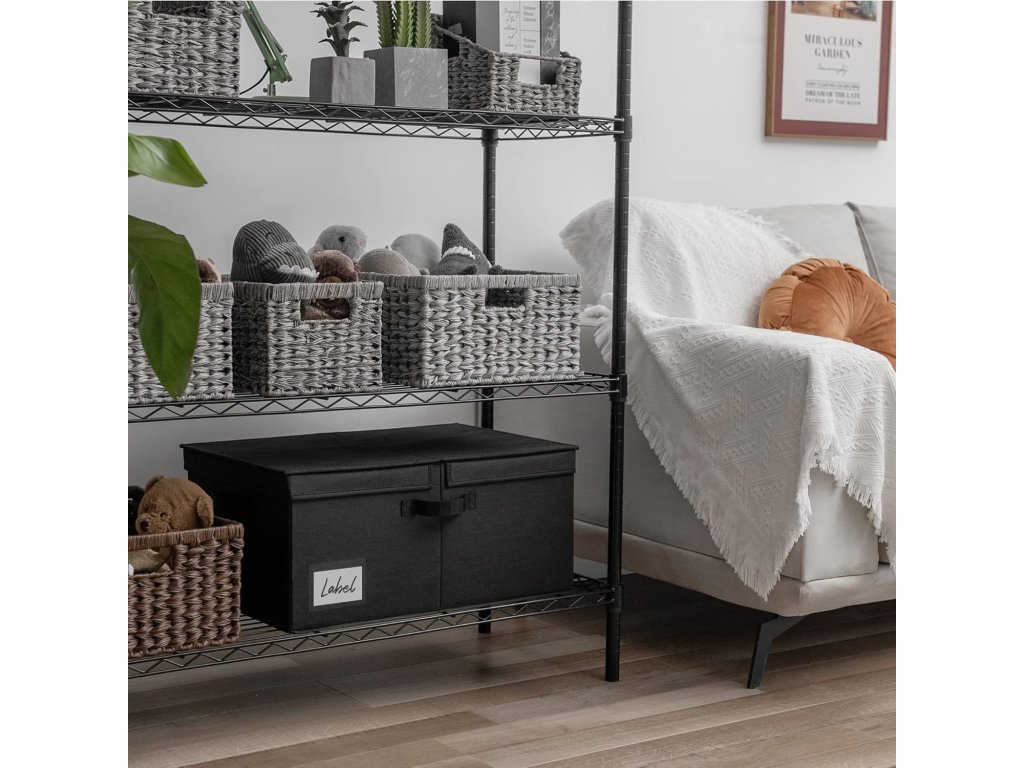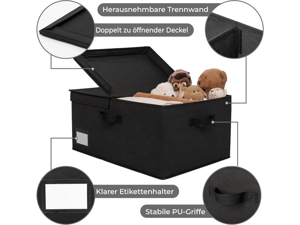 Tento extra velký látkový úložný box GRANNY SAYS s víkem v černé barvě nabízí velkorysý úložný prostor o rozměrech 58 x 41 x 26,5 cm (délka x šířka x výška), ideální pro uspořádání velkého množství věcí a udržení pořádku v každé místnosti. Je vyroben z vysoce pevných materiálů – zesílené imitace lnu, která je ze všech stran i zespodu vyztužena pevnou lepenkou, což zajišťuje jeho pevnost, odolnost a možnost stohování. Látkový povrch je navíc snadno omyvatelný vlhkým hadříkem. Praktické dvojitě otevíratelné víko chrání uložené předměty před prachem a usnadňuje jejich ukládání a vyjímání. Pro snadné přenášení je koš vybaven dvěma pevnými madly. Díky skládacímu designu je koš velmi snadno rozložitelný a ihned připraven k použití, a když jej nepotřebujete, lze jej jednoduše složit a uskladnit, čímž šetříte místo. Tento elegantní a prostorný úložný box je univerzální a hodí se do ložnice, dětského pokoje i do skříní na ukládání oblečení, hraček, ručníků, knih a dalších předmětů.