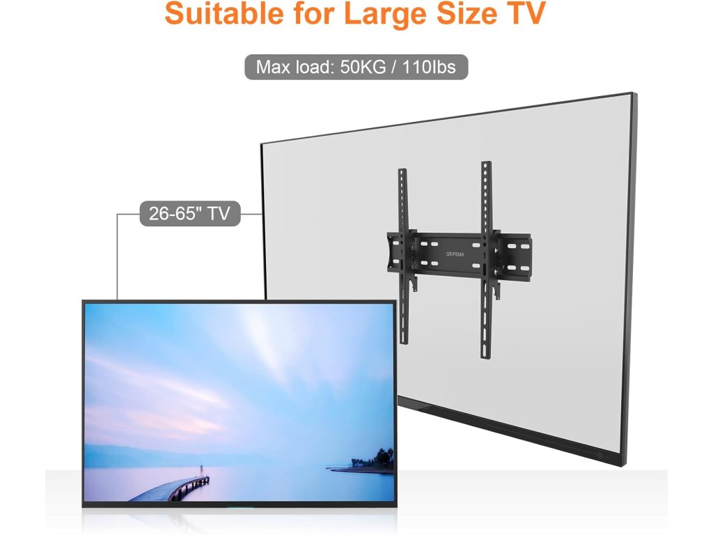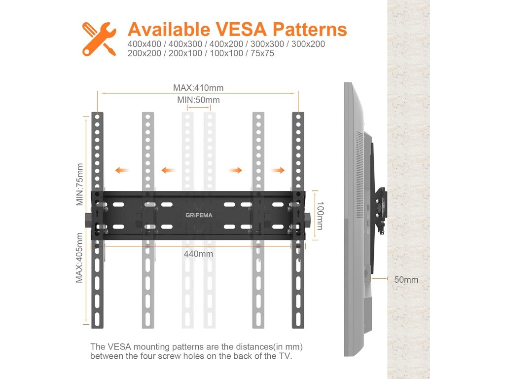 GRIFEMA GB1004-2 je univerzální nástěnný držák určený pro ploché i zakřivené televizory a monitory s úhlopříčkou 26–55" a maximální hmotností 50 kg. Držák podporuje standardy VESA od 75×75 do 400×400 mm. Před instalací doporučujeme ověřit kompatibilitu s konkrétním televizorem.