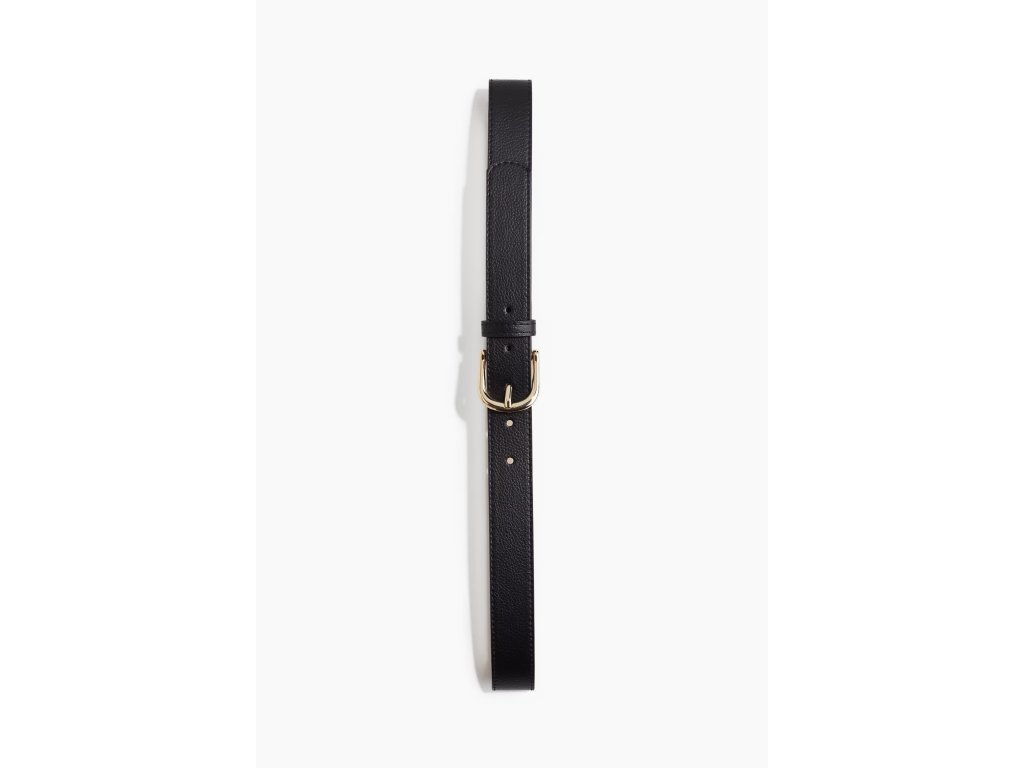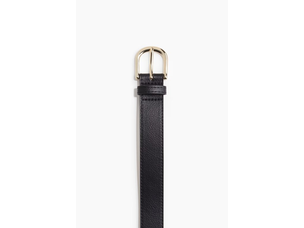 Černý pásek H&M s jednoduchým designem a kovovou přezkou ve zlaté barvě. Díky svému vzhledu se hodí jak ke kalhotám, tak i k šatům nebo sukním.