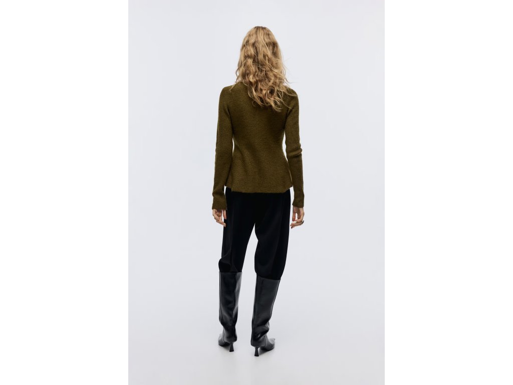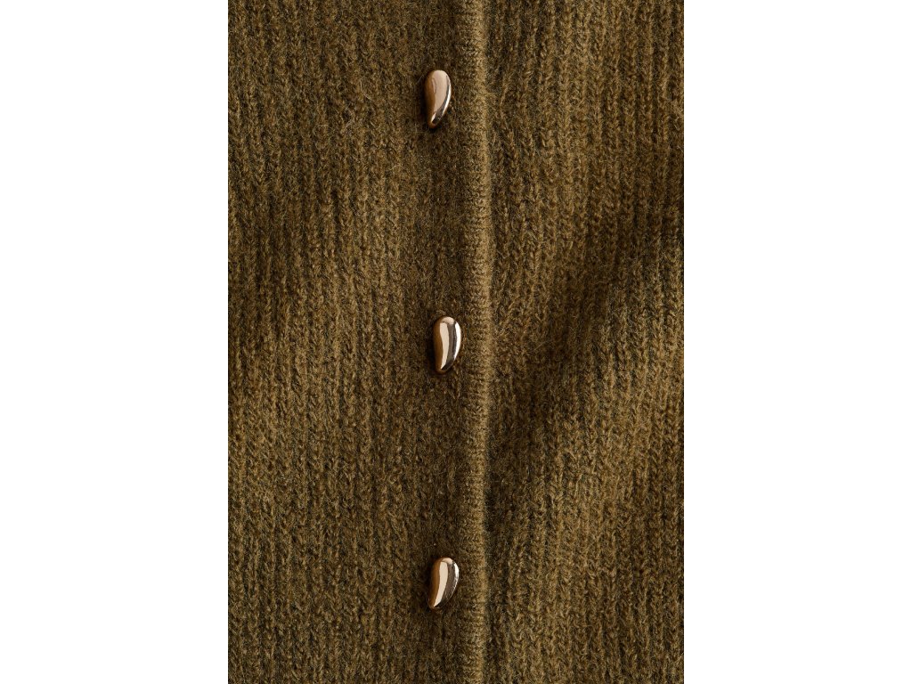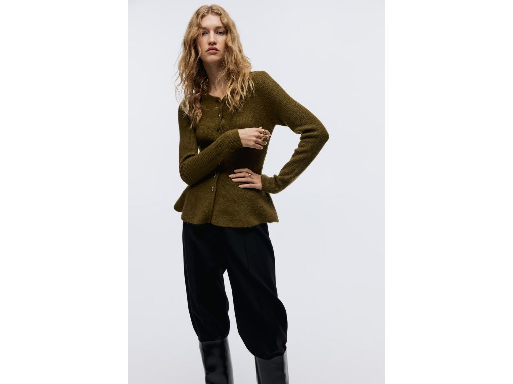 H&M dámský propínací svetr peplum – žebrovaný úplet, khaki zelená (vel. S)