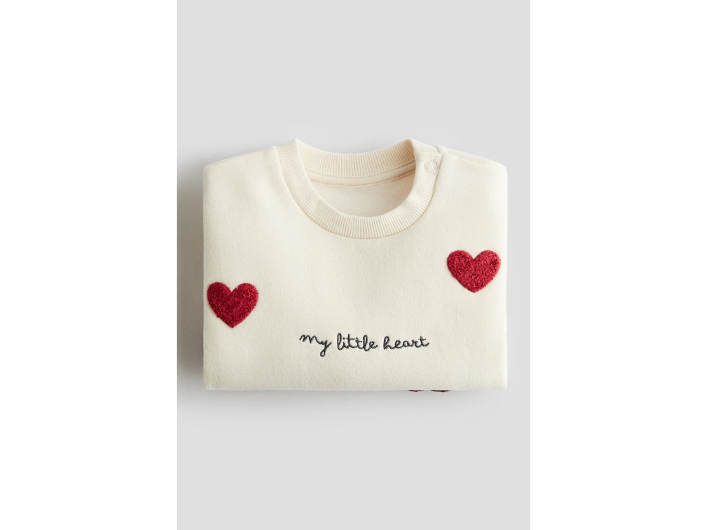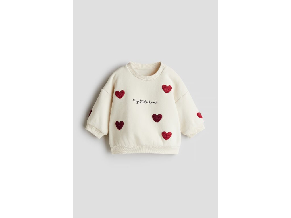 Pohodlná dětská mikina H&M z měkké teplákoviny s česaným rubem, která poskytuje příjemné teplo a komfort při každodenním nošení. Roztomilý motiv srdíček dodává mikině hravý vzhled.