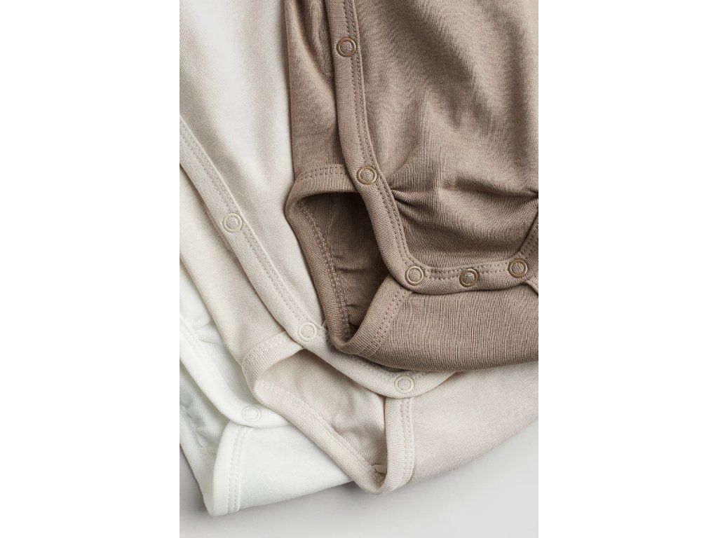 Souprava H&M je vyrobena ze 100% bavlny s vysokým podílem biobavlny, která je šetrná k citlivé dětské pokožce. Body mají praktické zavinovací zapínání s druky po stranách a v rozkroku pro snadné přebalování.