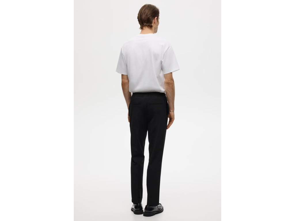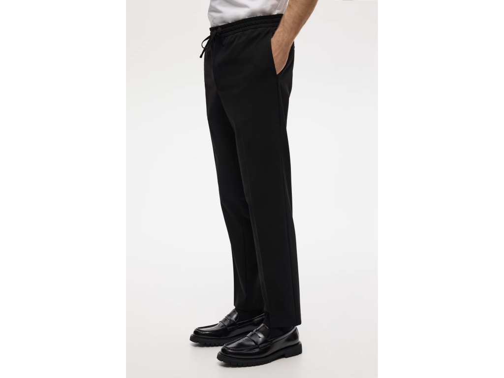 Kalhoty mají krytou gumu v pase se stahovací šňůrkou, takže dobře sedí a přizpůsobí se postavě. Nechybí falešný poklopec, boční kapsy a zadní výpustkové kapsy, které dodávají kalhotám elegantní vzhled.