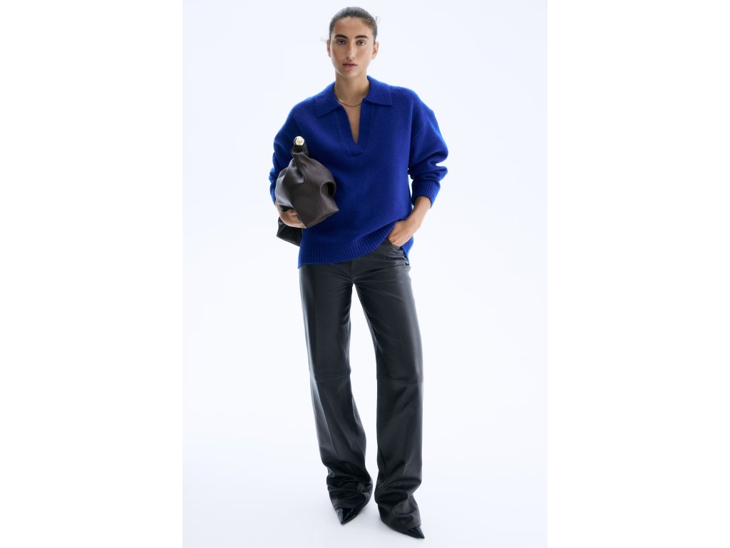 Svetr má žebrovaný límec s výstřihem do jemného véčka, který dodává modelu elegantní a moderní vzhled. Díky spuštěným ramenům a loose fit střihu působí svetr uvolněně a pohodlně.