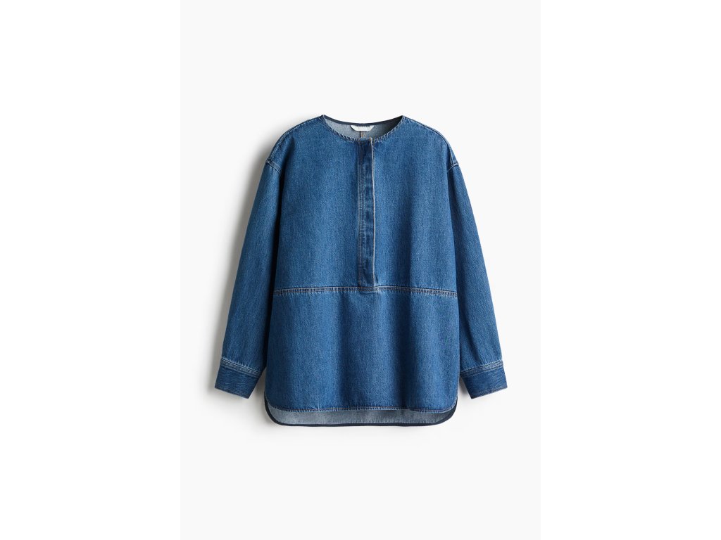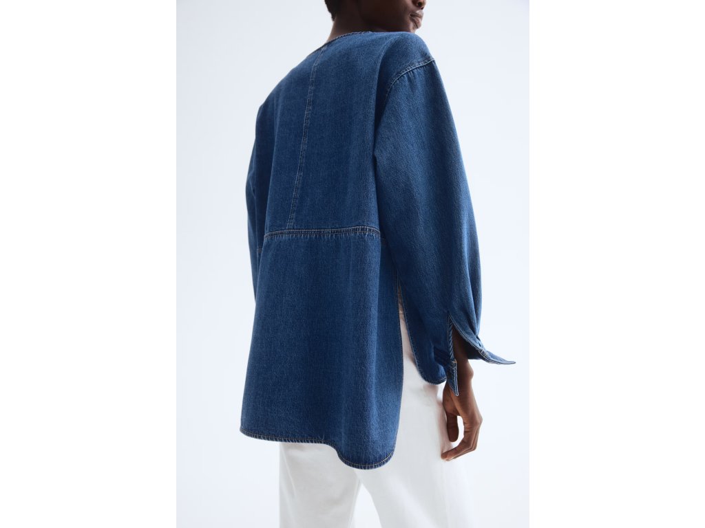 Dolní lem je zakulacený s hlubšími bočními rozparky a zadní část je mírně prodloužená, což vytváří elegantní siluetu a umožňuje pohodlné nošení přes kalhoty nebo zastrčené v pase.